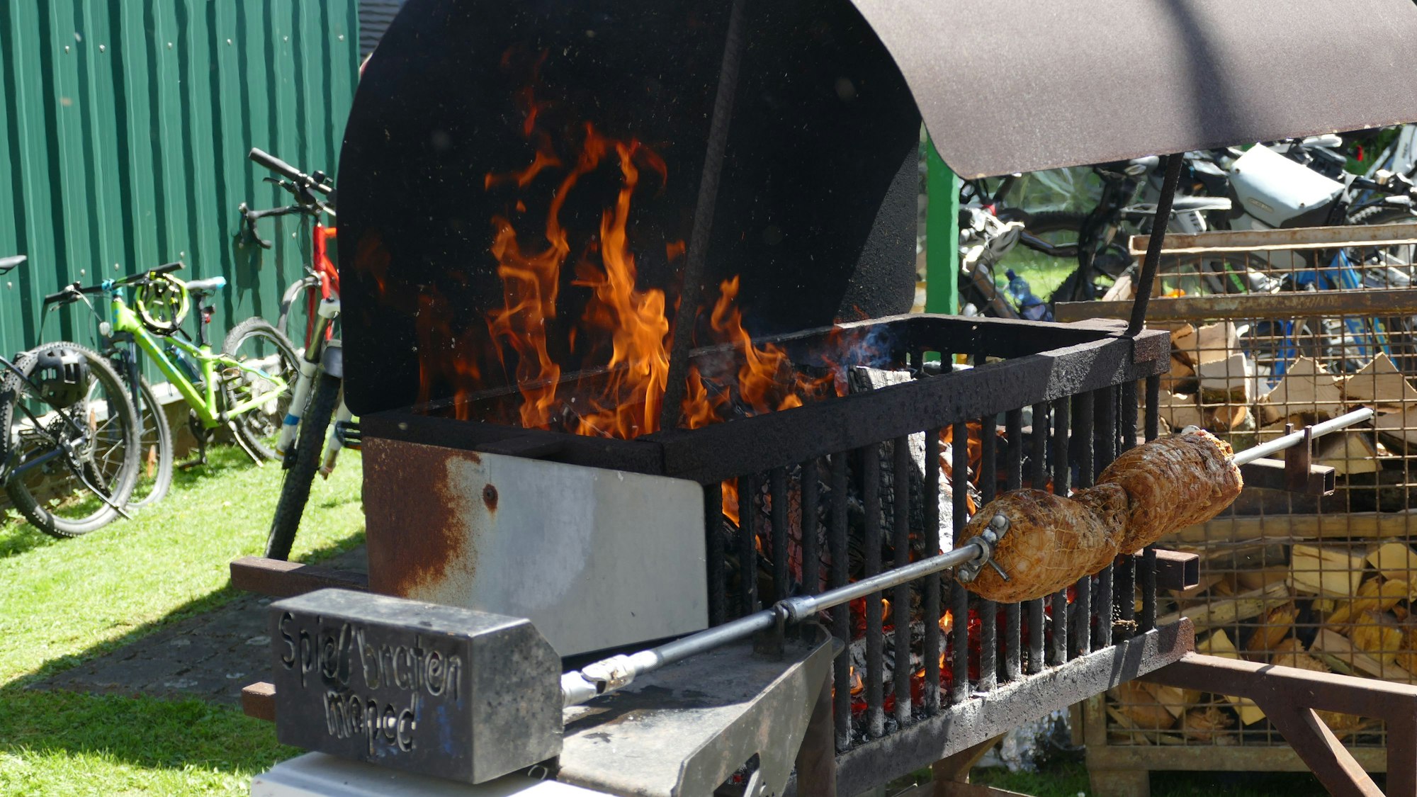 Spießbraten gibt es an der L333 bei Windeck-Hoppengarten.
