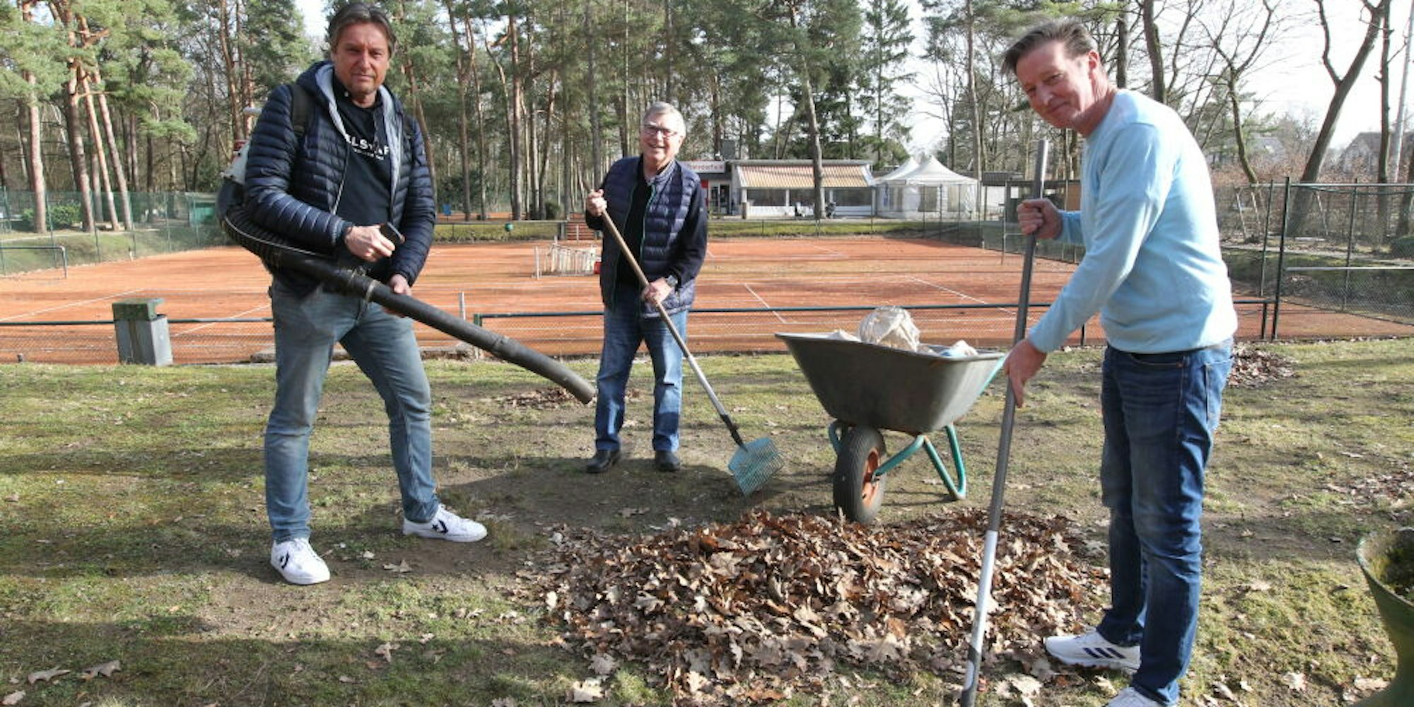 Beim Tennisclub RW Troisdorf wird derzeit die Platzanlage instand gesetzt mit Sportwart Claus Dreser, Präsident Uwe Maaß und dem Vorsitzenden Volker de Cloedt.