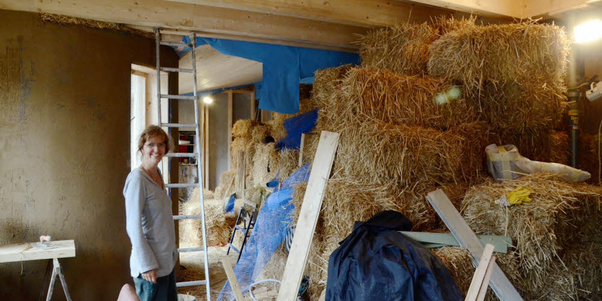 Aus der Nachbarschaft kommt das Stroh, „ganz normale Ballen“, nach Möglichkeit aus langen Halmen und etwas fester gepresst, muss der Bauer liefern. 350 Ballen wurden in Bergheim in eine Holzständerkonstruktion eingepasst, ein Gemisch aus Lehm und Stroh macht die Wände dicht. Lehmputz kommt innen auf die Wand; außen sorgt Sumpfkalkputz für Wetterfestigkeit. „Atmende Wände“ sind das Ziel – auch wenn Dennis Harms betont, dass er den Ausdruck nicht mag. So oder so sind sie normal nach der Fertigstellung normal belastbar; nur für das Aufhängen zum Beispiel von Küchenschränken sollte man Vorkehrungen treffen, betont Dennis Harms.