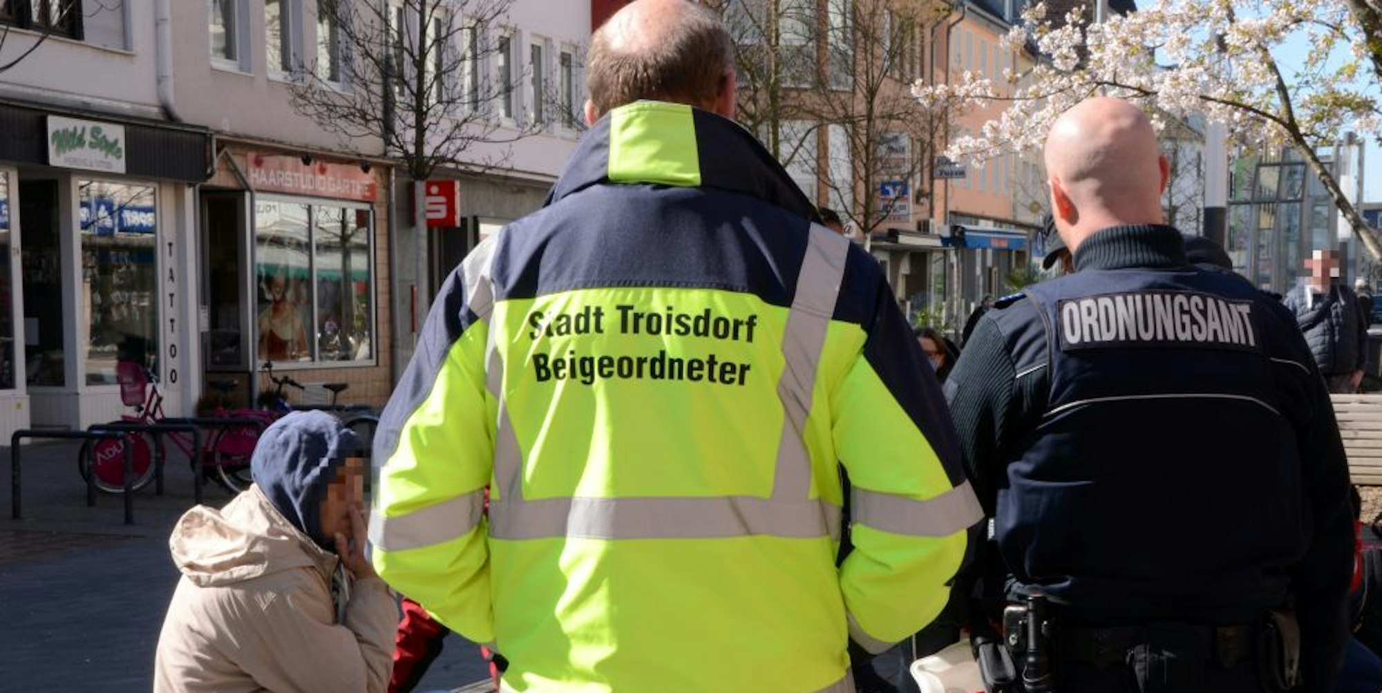 Bei der kleinen Gruppe hinter der Galerie am Wilhelm-Hamacher-Platz bleibt es heute noch bei einer mündlichen Ermahnung. „In jeder Straße nur zwei Personen“, lautet die Ansage, mit der Christian Hergarten das Grüppchen zerstreut . Denn klar ist auch die zweite Hälfte der Weisung: „Der Ton wird schärfer“, macht er den Männern und Frauen klar. Es wird nicht bei mahnenden Worten bleiben, mindestens 200 Euro Bußgeld sieht die Rechtsverordnung bei Verstößen vor.