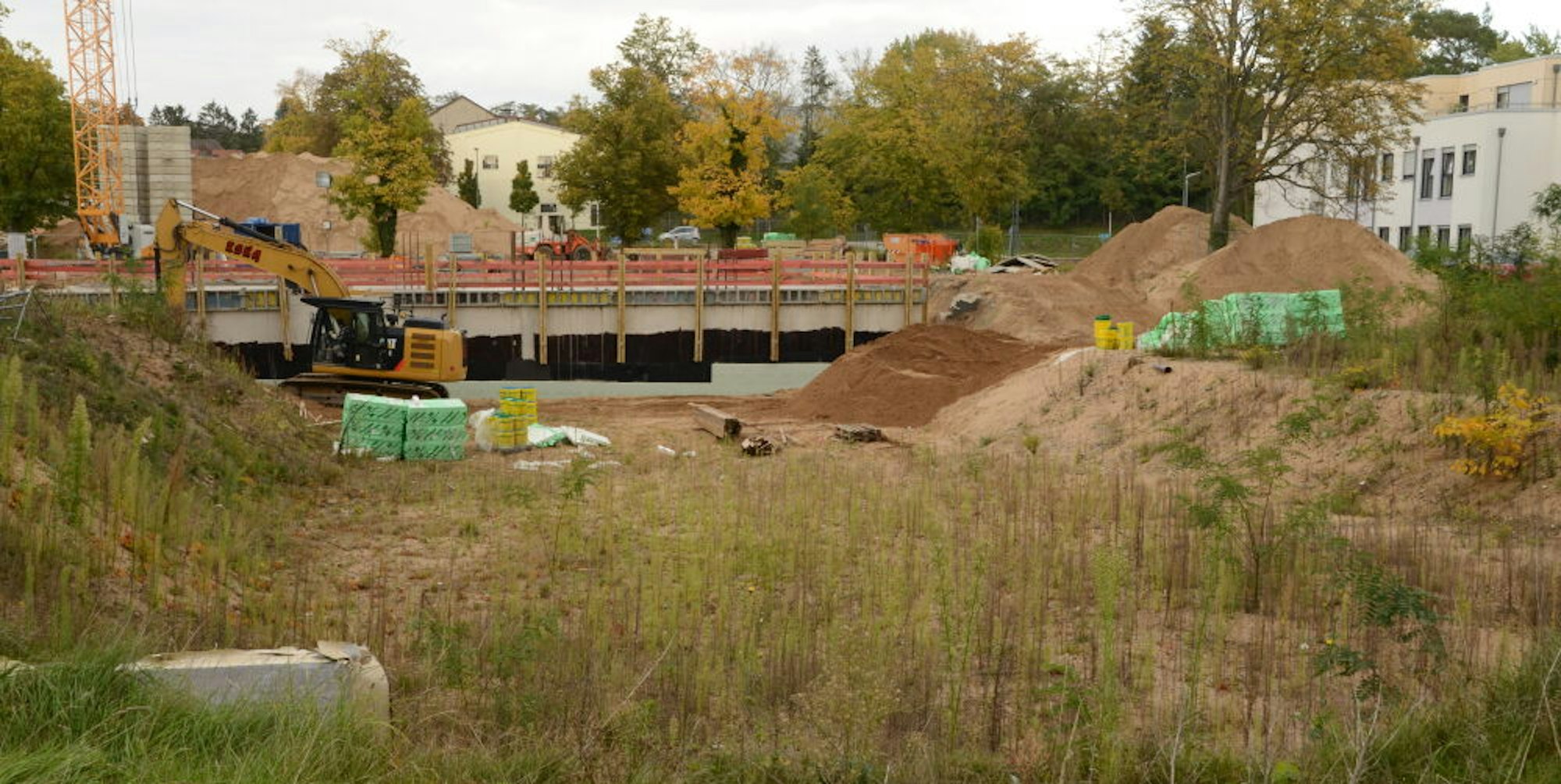 In der Baugrube wächst Unkraut, während die Arbeiten an dem im Auftrag der Tropark geplanten Bürogebäude voranschreiten.
