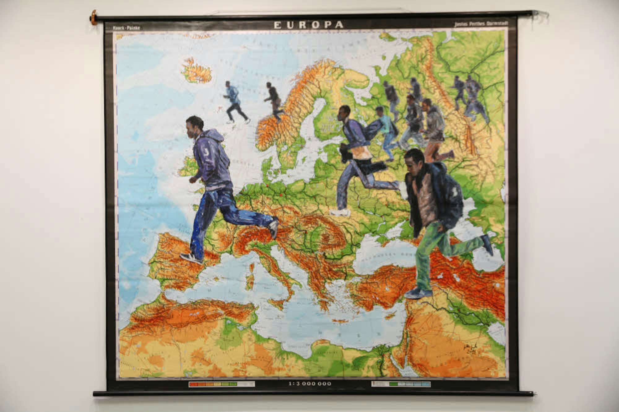 Ebenfalls vor eine alte Europakarte hat Jertz einen Mann gesetzt, der sein Gesicht unter der Kapuze seines Pullovers verbirgt. Müdigkeit oder Verzweiflung könnten der Grund sein, jedenfalls stellt auch dieses Bild eine Aufforderung zur Auseinandersetzung mit dem Thema dar.