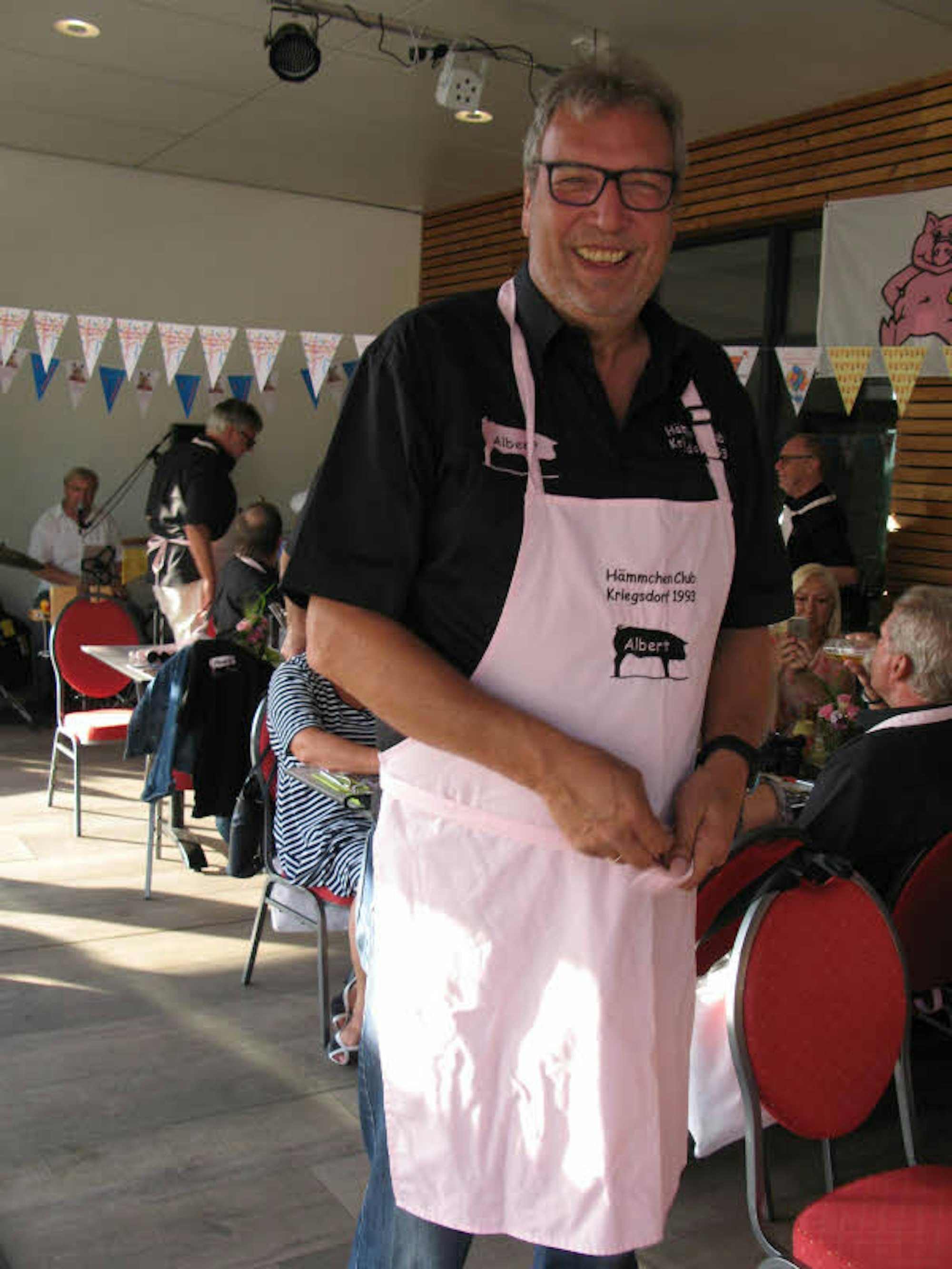 Die rosafarbene Schürze, die sich Albert Ossendorf umbindet, zählt zur Ausstattung der 15 Clubmitglieder. Hämmchen und Beilagen trafen mal wieder genau den Geschmack der Eisbein-Experten. Clubwimpel, Maskottchen Michaela und andere Schweinchen sind immer dabei.