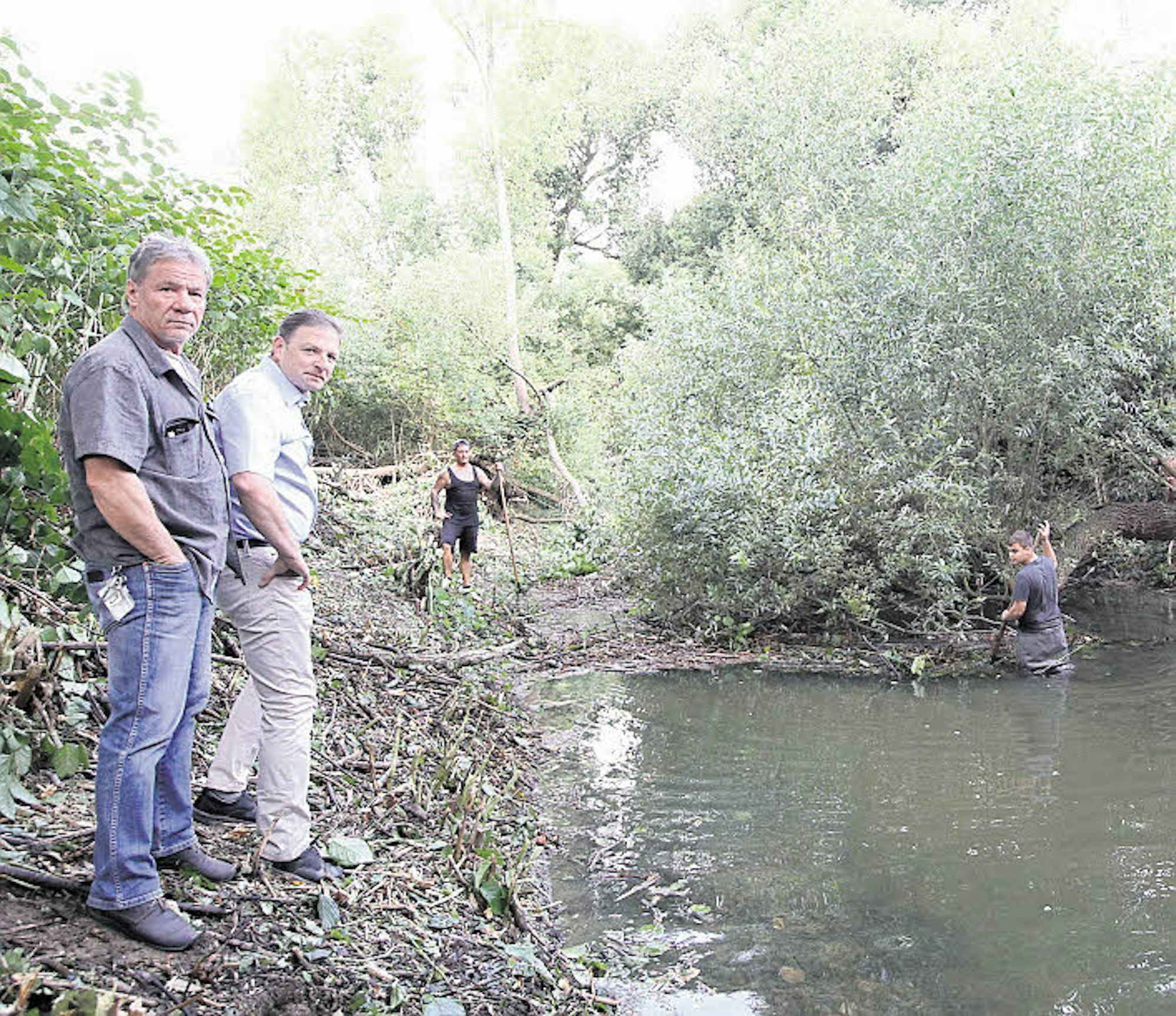 An vier Gartenbau-Betrieben sind die Arbeiten vergeben worden. „Wir haben darauf geachtet, ansässige Unternehmen auszuwählen“, sagt Diplom-Chemiker Dr. André Baade vom Troisdorfer Abwasserbetrieb und schaut Georg Lenz dabei zu, wie der Chef des gleichnamigen Garten- und Landschaftsbaubetriebs an der Brücke an der Meindorfer Straße in Sieglar bündelweise Algen aus dem Mühlengraben zieht. Lenz steht knietief im Bachlauf.