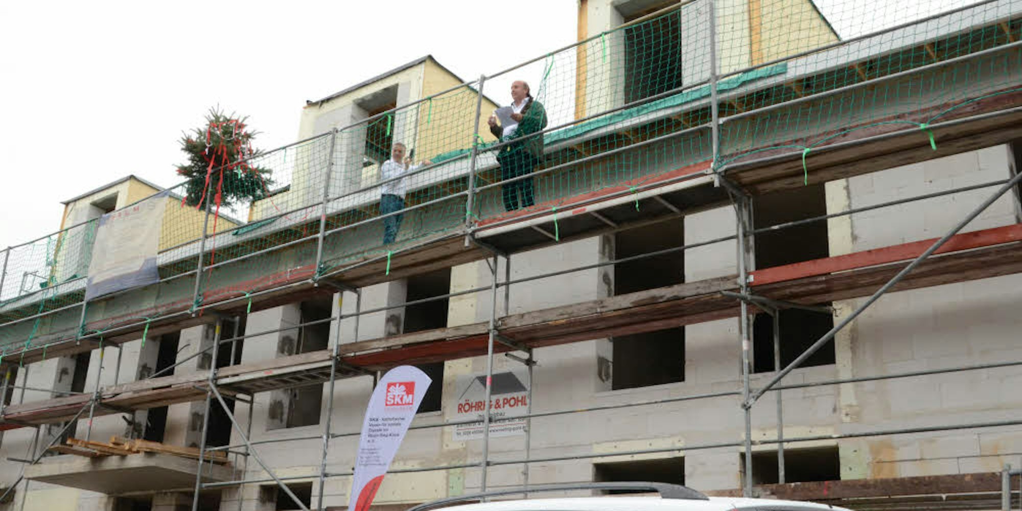 Troisdorf – Ein festes Fundament habe das Projekt, schützende Wände, aber auch Fenster, die den Blick in die Zukunft eröffnen: Vizebürgermeisterin Angela Pollheim sah in der Architektur des Vorhabens viele Symbole. In die Donawitzstraße war die Sozialdemokratin gekommen, zum Richtfest hatte der Katholische Verein für Soziale Dienste (SKM) eingeladen. Der baut derzeit elf Wohnungen für Menschen und Familien mit geringem Einkommen.