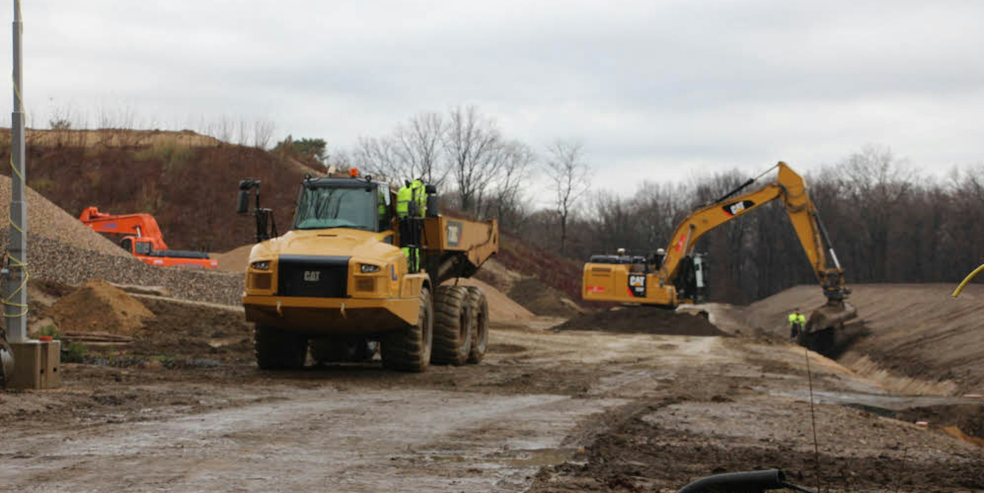 Anwohnern war aufgefallen, dass in den vergangenen Monaten ein verstärkter Schwerlastverkehr über den Spicher Mauspfad abgewickelt wurde. „Das lag daran, dass wir nun die letzte Kiesschicht über der Abdichtung des Deponiebereichs 5.2 aufgebracht haben“, erläutert Mineralplus-Mitarbeiter Dirk Brüning. Er hat seinen Arbeitsplatz mitten im Wald und überwacht zusammen mit anderen Kollegen die Bauarbeiten.