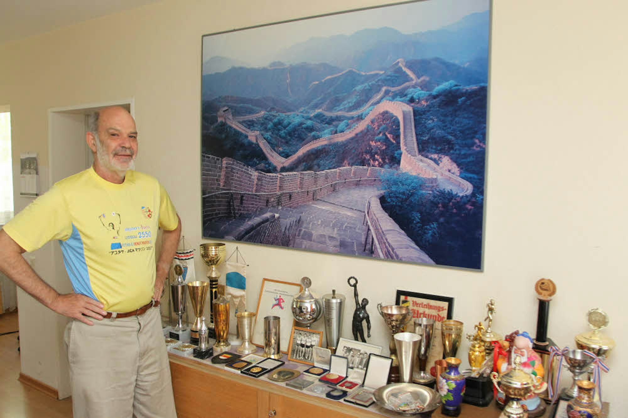 Troisdorf – In der Wohnung von Hanno Rheineck glänzt es: Seine Pokale stehen überall – auf der Fensterbank, dem Wohnzimmertisch und der großen Kommode. Nur auf seinem kleinen Schreibtisch ist noch Platz. Der 73-Jährige, 1,80 groß, schlaksig, im braunem Hemd und brauner Hose, hat seine Wettkämpfe alle gezählt, sagt er. Sein Leben besteht aus Zahlen: zwei Weltrekorde, 19 Mal Deutscher Meister, dreimal Europa- und fünfmal Weltmeister. Alles Siege bei den Senioren, also Läufern über 35.