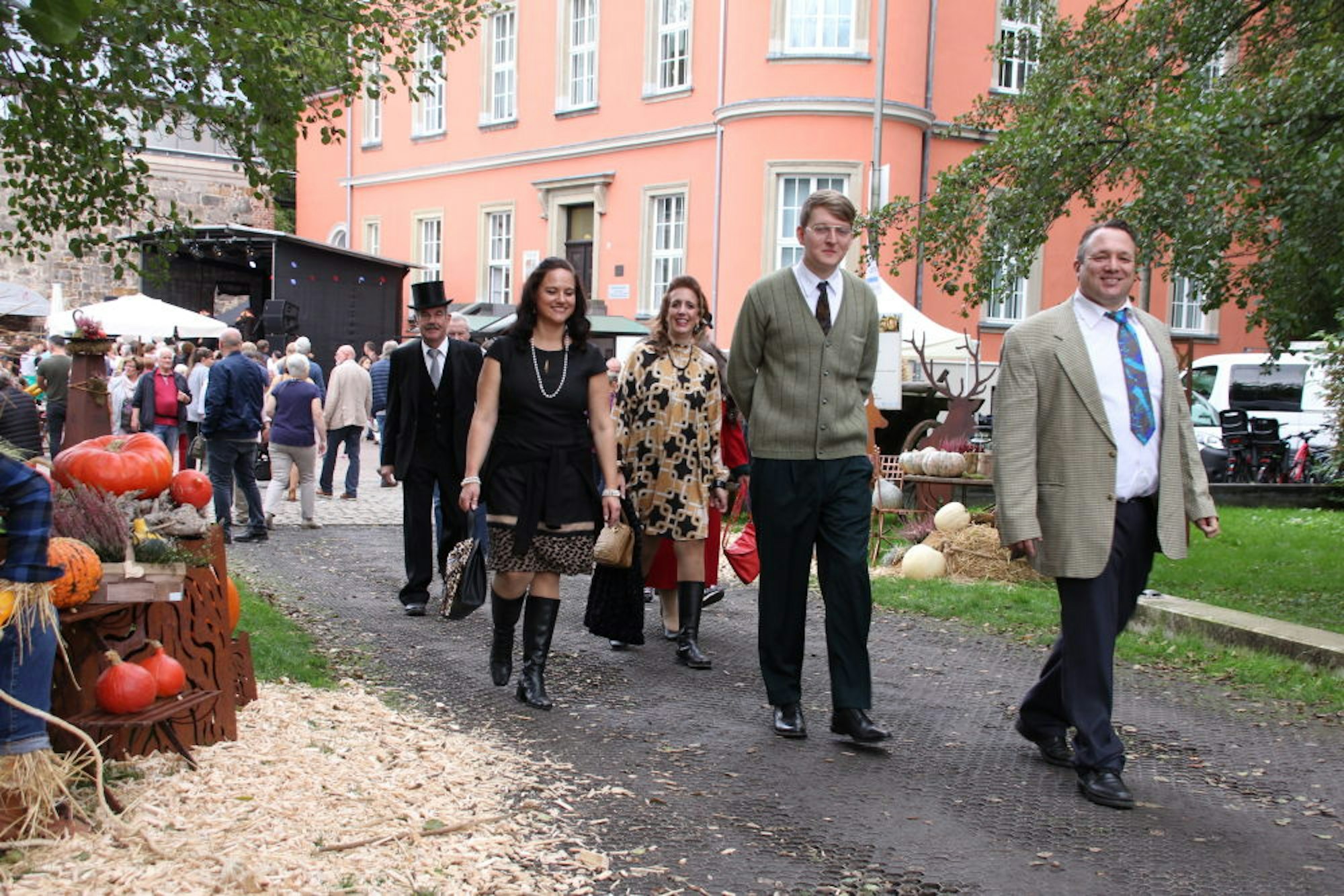 Im Publikum stand auch eine Gruppe, die sich – passend zum Jubiläum der Stadt – in Originalkleider aus den 60er-Jahren geworfen hatte und vorbei an den Ständen wandelte, zu Karnevalsmusik schunkelte oder bei „Running 5“ mitrockte. Es waren Mitglieder vom Männerballett „Los Möhnos“ mit ihren Partnerinnen. Sie hatten sich bei der CDU-Kleiderstube Hennef, der Nachbarschaftshilfe und aus dem eigenen Kleiderschrank eingedeckt. Tatsächlich waren sie ein ziemlich authentischer Augenschmaus, von den Besuchern, die sich vorbei schoben an den Erntegaben, mit Freuden, aber auch Staunen beäugt.