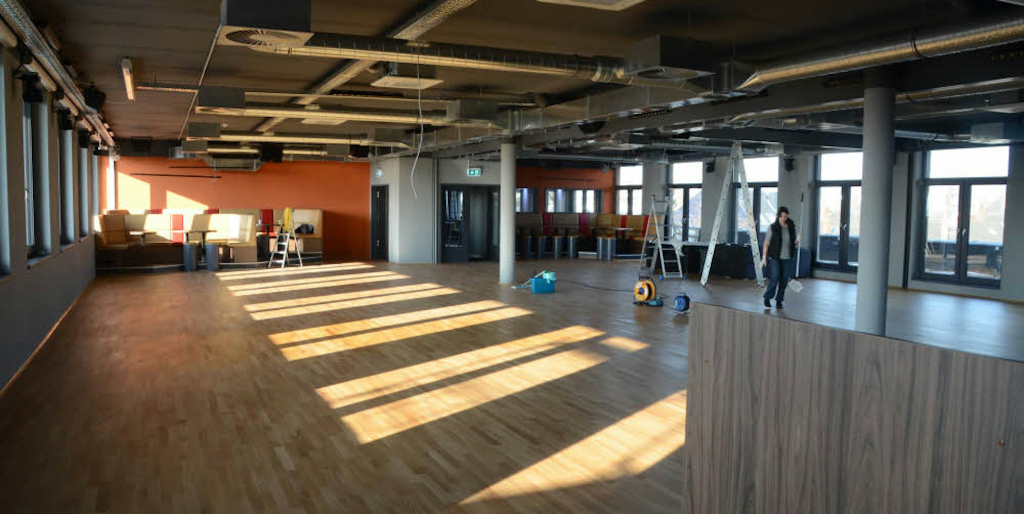 „Wir sind fertig“, betont der Geschäftsführer, doch für Bewegung sorgt im großen Saal nur die Putzfrau.