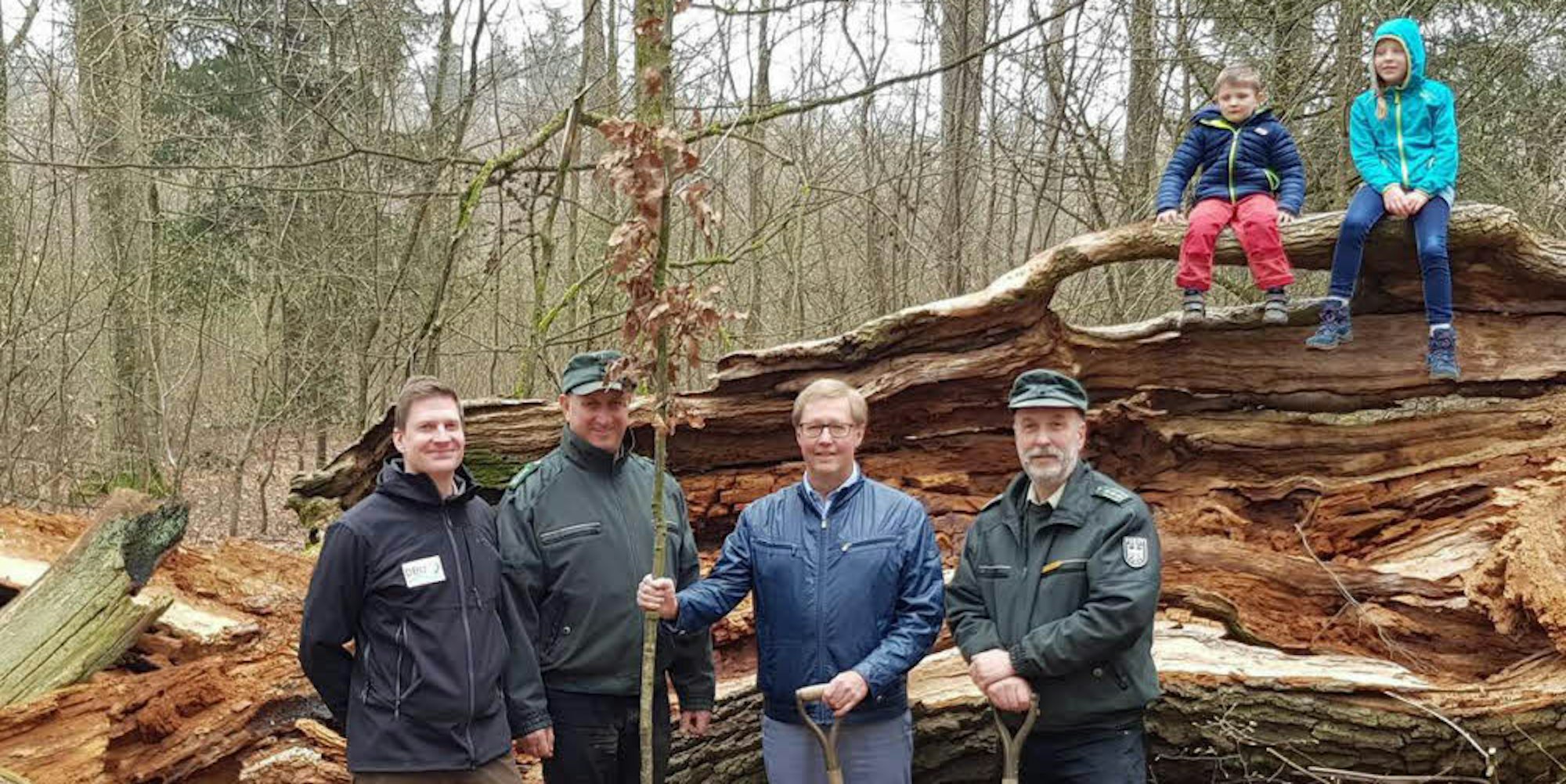 Den neuen Baum pflanzten (v. l.) Michael Diekamp vom DBU Naturerbe, Bundesforstmitarbeiter Klaus Oehlmann, Ortsvorsteher Achim Tüttenberg und Bundesforstmitarbeiter Achim Urmes.