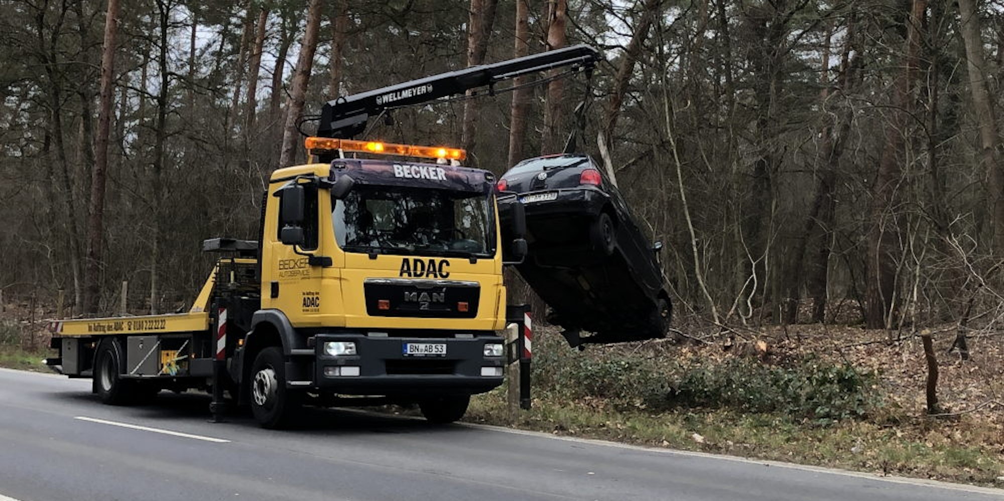 Ein Kran musste das Fahrzeug aufwendig aus dem Waldstück herausholen.