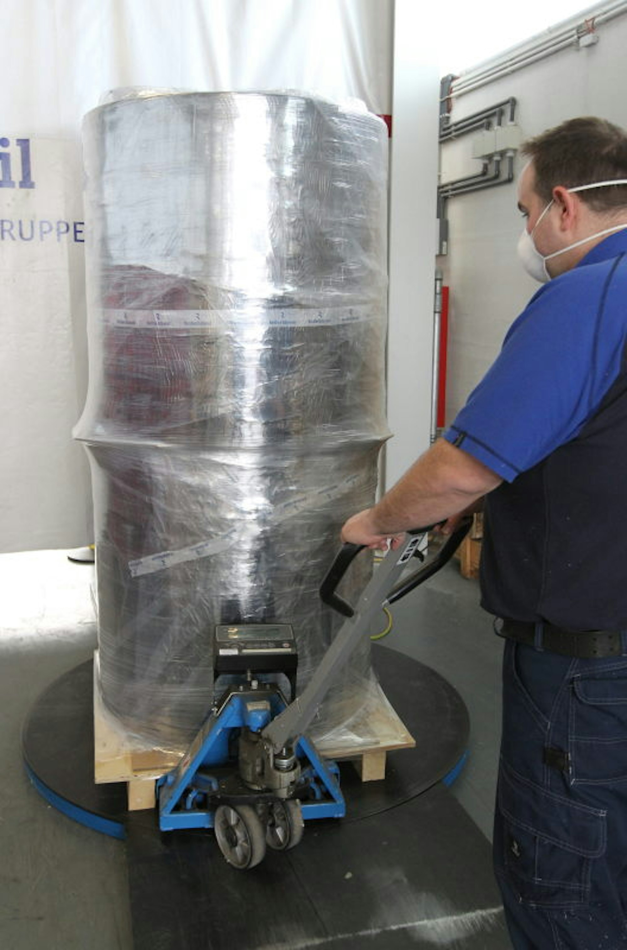 Zwei fertige Rollen sind verpackt und bereit zum Abtransport.