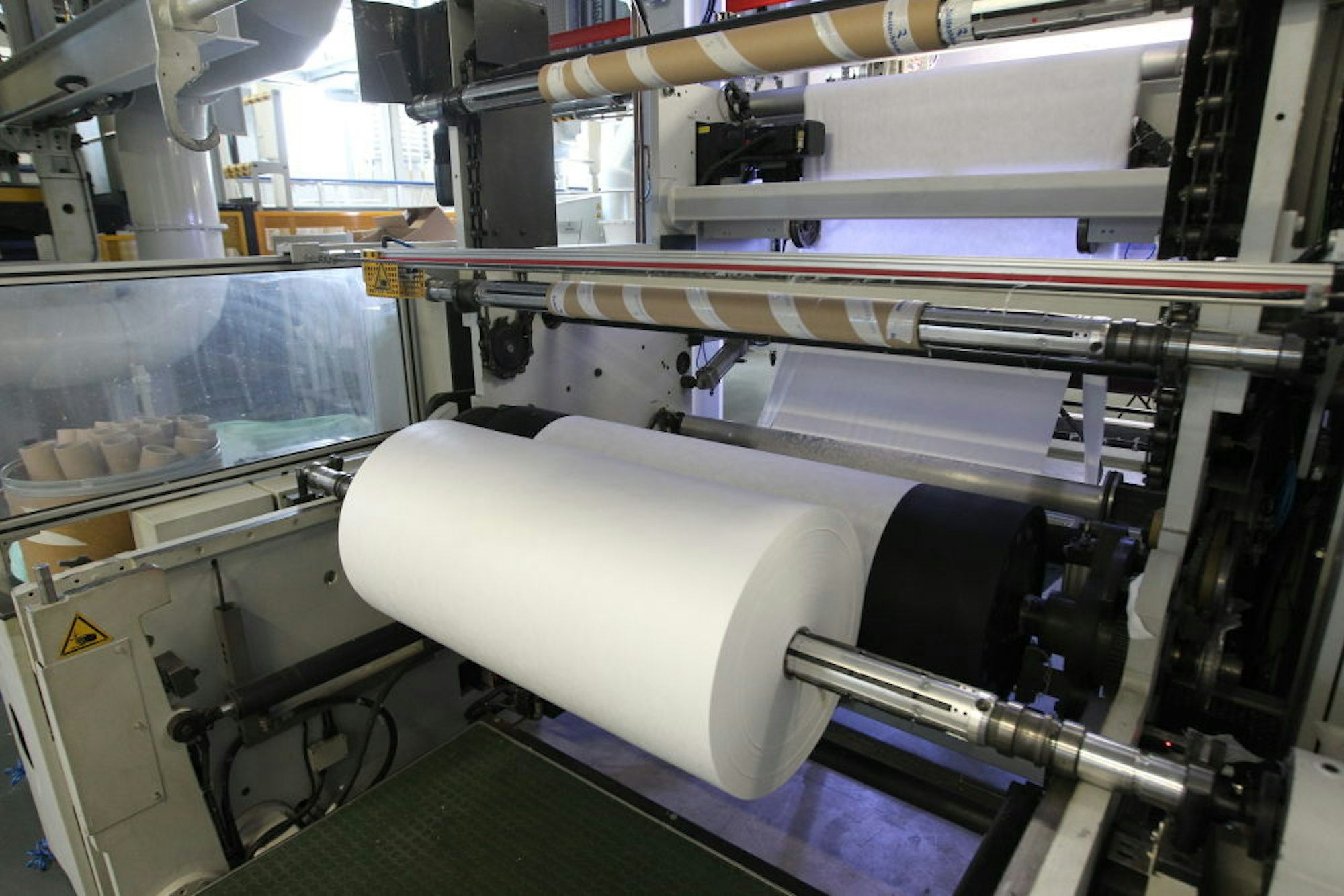 Wie sehr dünne Spaghettifäden fließt der erhitzte Kunststoff aus unzähligen Düsen und wird zu langen, weißen Bahnen abgelegt. „Meltblown“ heißt dieser Kunststoffverarbeitungsprozess und ebenfalls das Material, das wie ein Gewebe wirkt, aber aus endlos langen, wirr abgelegten Kunststoffsträngen besteht. Meltblown bildet in Gesichtsmasken die entscheidende Filterfunktion und ist damit ein unverzichtbarer Bestandteil, um Ärztinnen und Ärzte sowie Pflegepersonal vor einer Ansteckung zu schützen. Aufgewickelt auf einen Kern wirken die Ballen vom Weitem wie monströse Garnrollen.