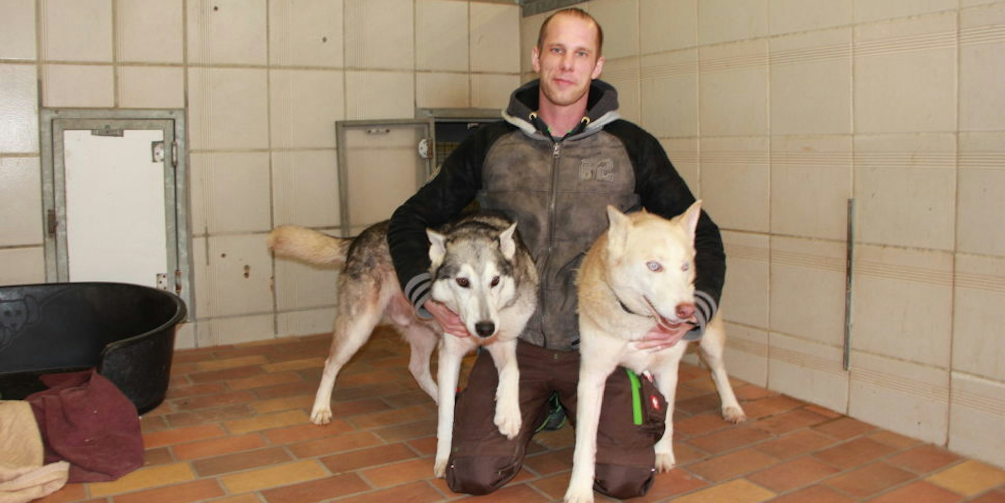 Der Auszubildende Ben van Melkebeke mit zwei der zehn Husky-Mischlinge, die vorige Woche im Tierheim eingeliefert wurden.