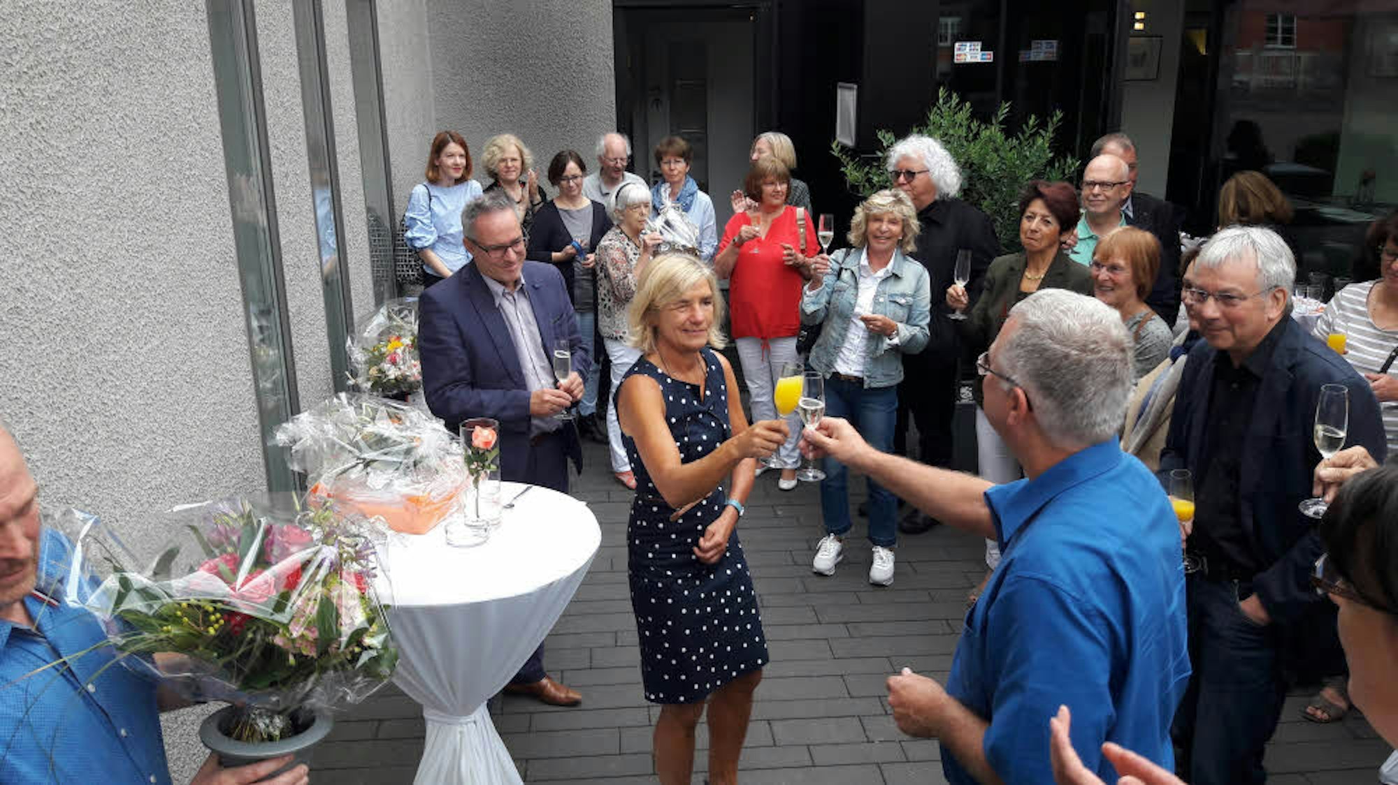 Anstoßen mit dem Bürgermeister: Die scheidende Kuratorin wurde gestern im Hof von Burg Wissem von zahlreichen Wegbegleitern gefeiert.
