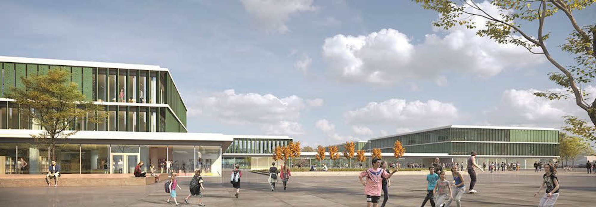 Der auf Platz eins gesetzte Entwurf „erfüllte am besten die hohen Anforderungen“, begründeten die Juroren ihre Wahl. So „präzise wie eindrucksvoll“ bilde er die verschiedenen Nutzungen ab, schaffe zusammen mit dem Gebäudebestand „ein attraktives und identitätsstiftendes Ensemble“ für Ortsteil und Schulzentrum. Die Planer sehen vor, dass man über einen öffentlichen Platz die Bibliothek und die Aula/Cafeteria erreicht: Teile der Schule, die auch in Zukunft für die Allgemeinheit nutzbar sein sollen. Das Bibliotheksgebäude, wo auch die Heizzentrale für das gesamte Schulzentrum untergebracht ist, wird saniert.