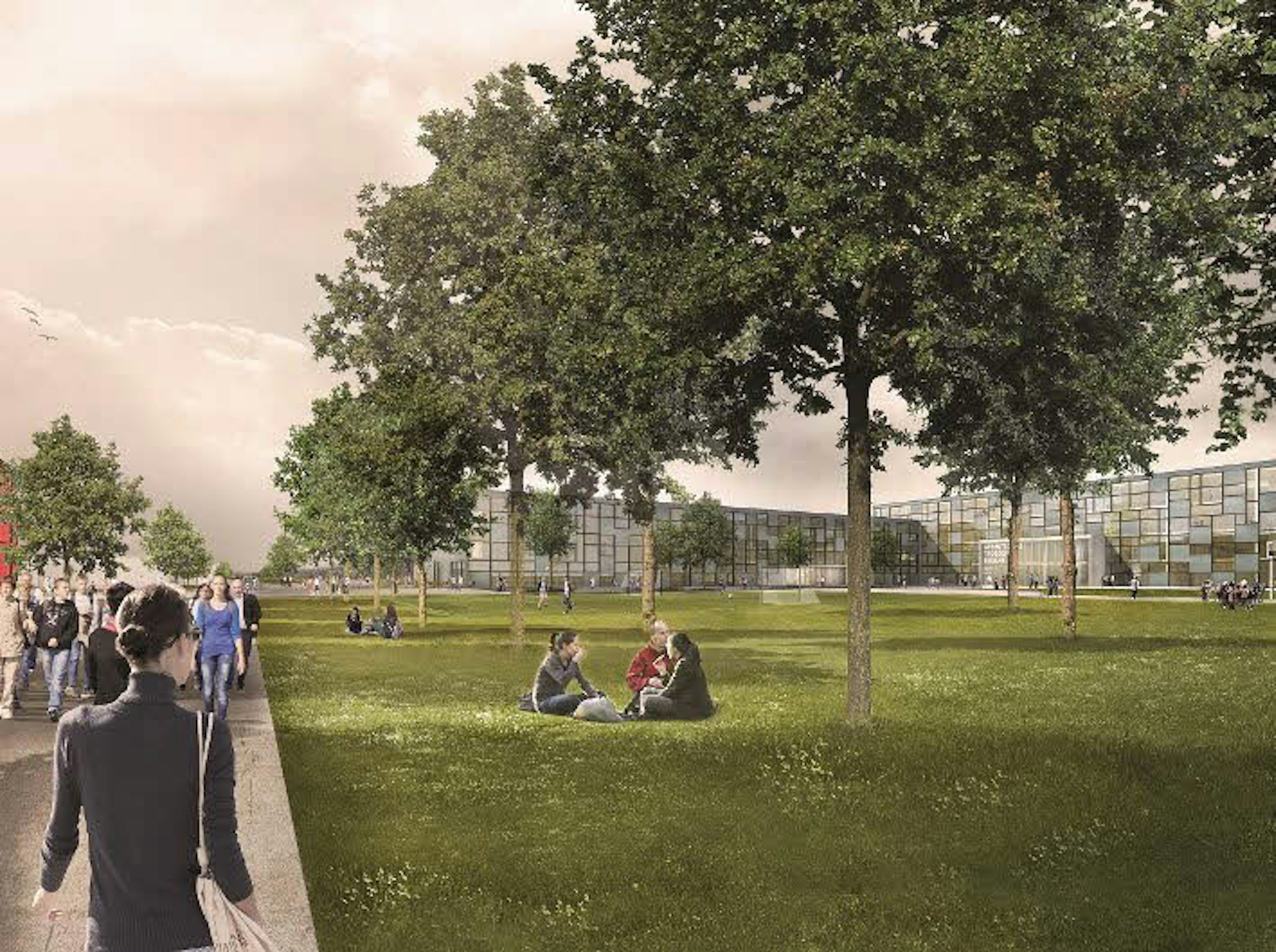 Nördlich der heutigen Schule entsteht ein weiterer Neubau, gemeinsam fassen die Gebäude und ein überdachter Umgang den Pausenhof. Vorgesehen ist überdies eine Verlegung der Parkplätze auf die Fläche zwischen Neubau und Schwabenweg.
