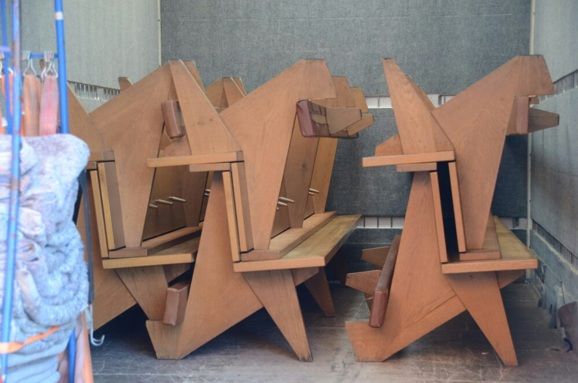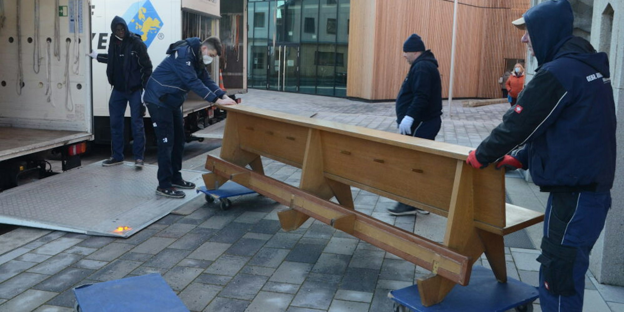 Für ein Jahr kommen die Bänke aus der katholischen PfarrKirche St. Hippolytus in der Innenstadt ins Möbellager.