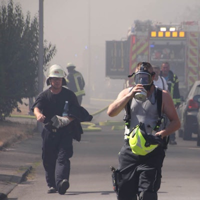 Thilo Götz, mit 48 Jahren der Älteste, ist nach 7:30 Minuten fertig, steigt herunter und lüftet erst einmal die Jacke. Kurz darauf ist Kremer durch, der es bewusst ruhiger hat angehen lassen. Die beiden Maskenträger benötigen natürlich länger, zwischen acht und neun Minuten. Am Ende haben sie gerade mal rund die Hälfte des Flascheninhalts aufgebraucht. „Als Übungszweck war das hervorragend“, sagt Formella. Derks erklärte aber auch, dass bei einem echten Einsatz andere Bedingungen herrschten. „Da ist die Hitze durch den Brand und wenig Sicht wegen des Rauchs.“