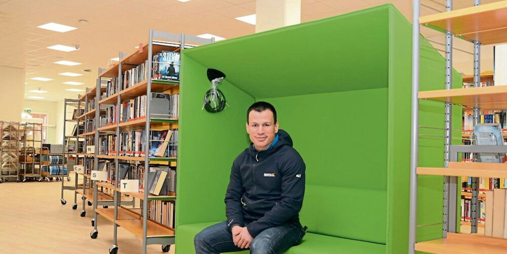 Die grünen Möbel sind wie das gesamte Mobiliar zum Rollen. Bibliotheksleiter Philipp Maaß sitzt schon einmal Probe.