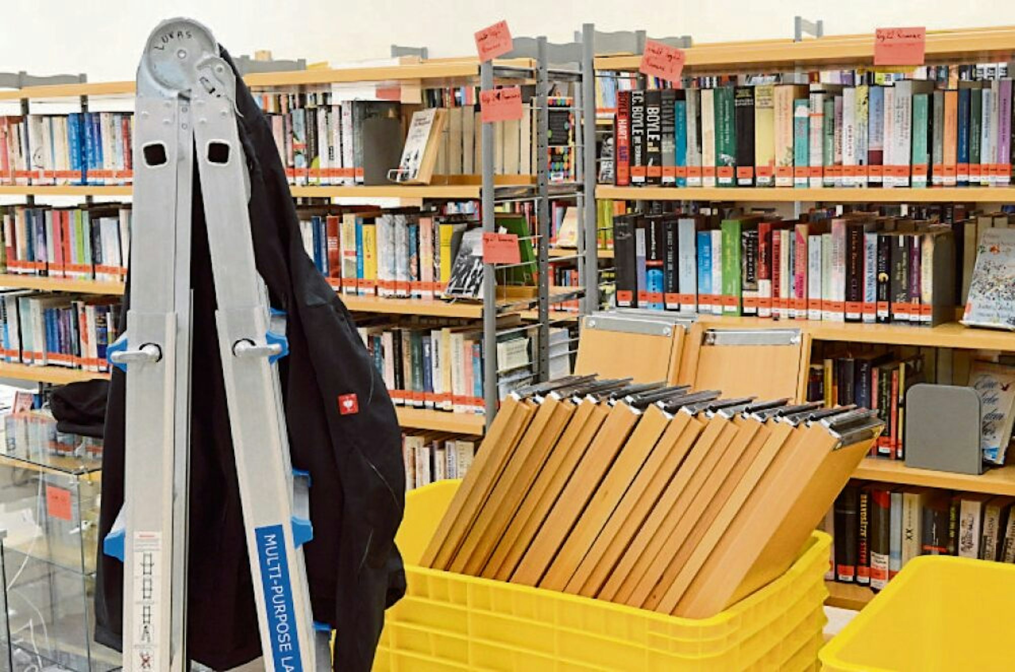 „Das Unternehmen hat Regal für Regal ausgeräumt“, erklärte Bibliotheksleiter Philipp Maaß; das Kistenpacken gehörte nicht zu den Aufgaben des insgesamt 15-köpfigen Teams. Dank spezieller Transportkisten blieb die Sortierung erhalten, nur „ein bisschen was muss nachsortiert werden“.