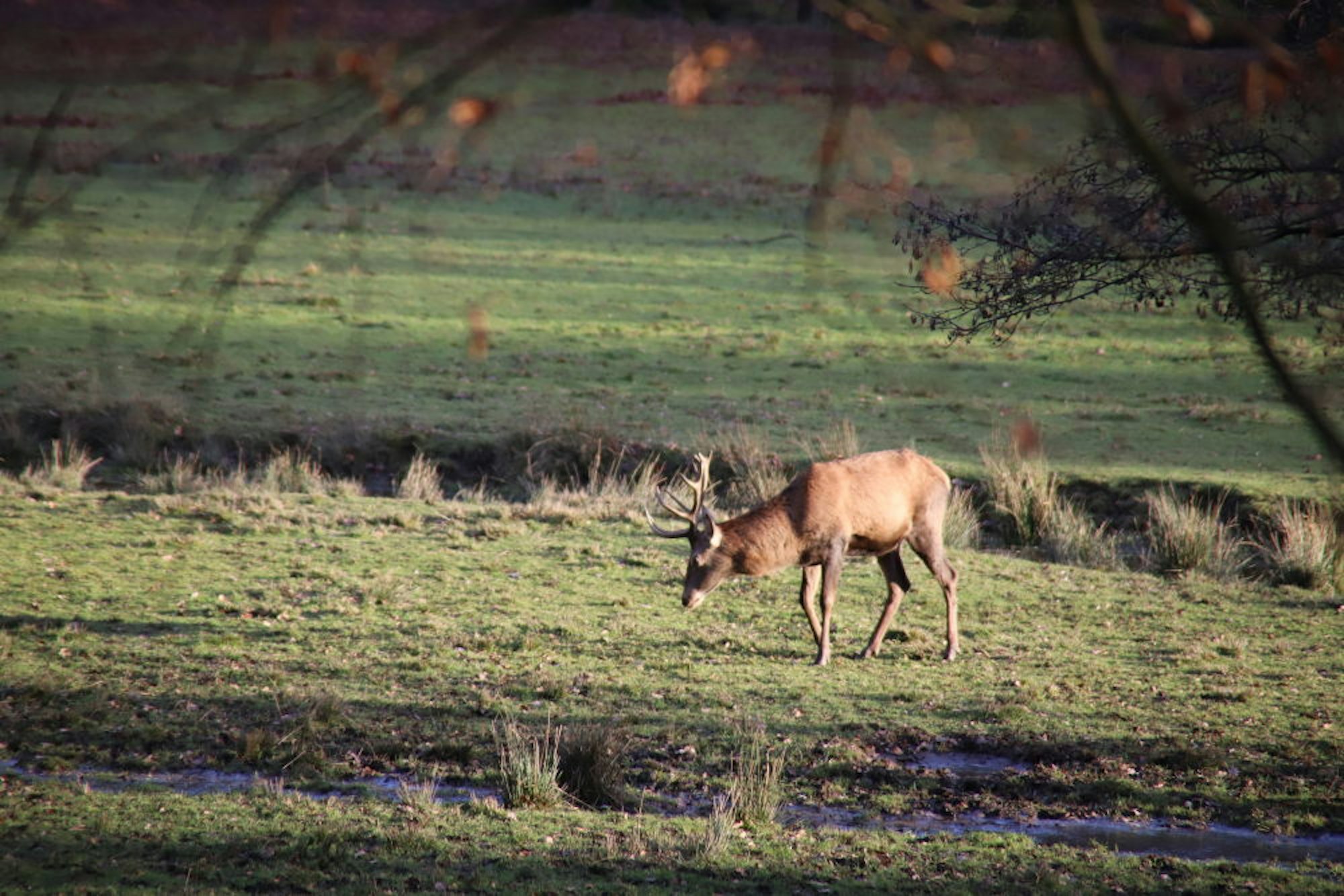 Im Park hinter der Burg Wissem äst dieser stattliche Hirsch. Neben dem Rotwild gibt es auch einige Sika-Hirsche im eigenen Gehege.