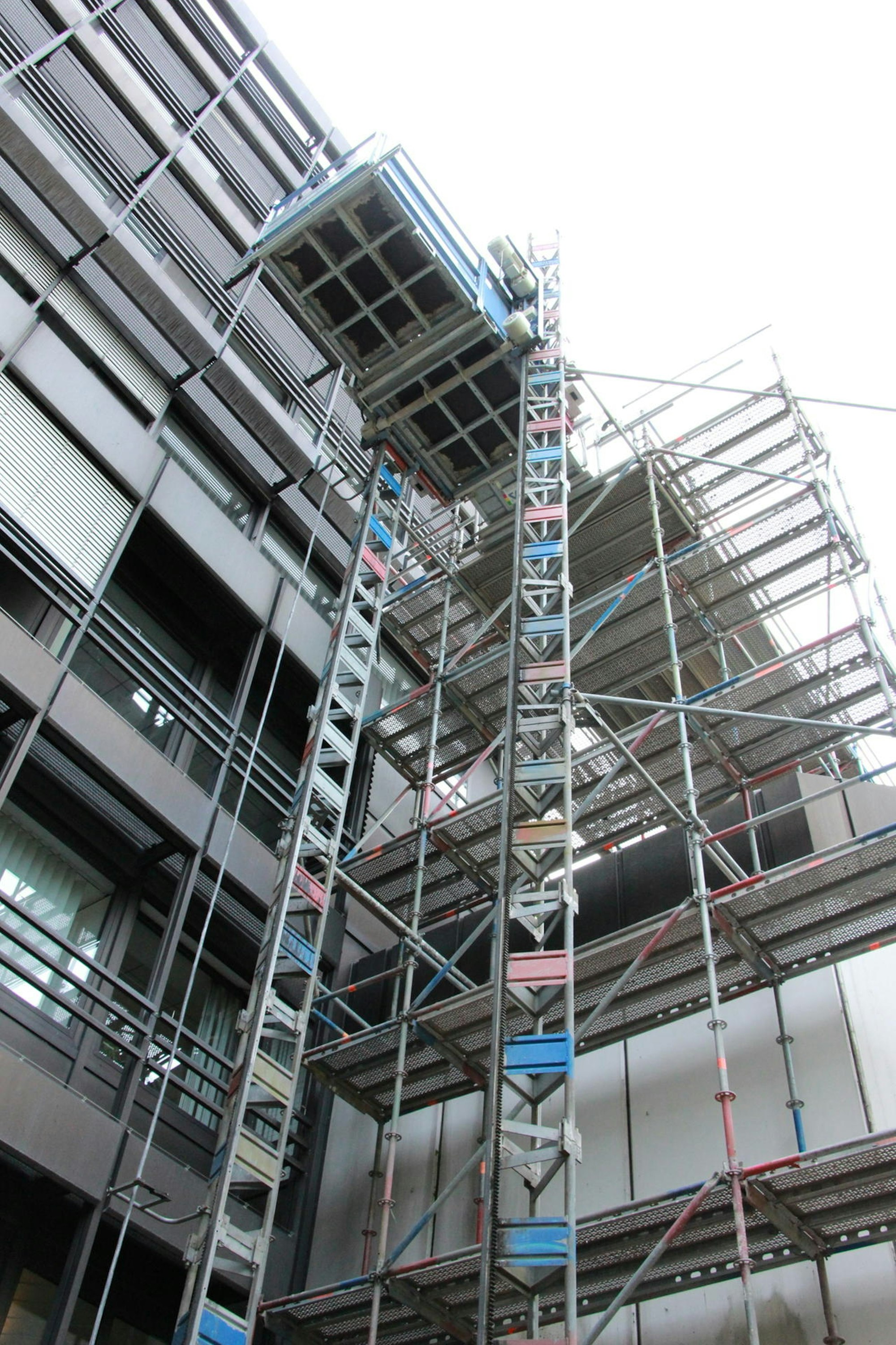 Ein mächtiger Lastenaufzug an der Rückseite des Rathauses zeigt, dass im Inneren des Gebäudes aus den 70er Jahren Bauarbeiten stattfinden.