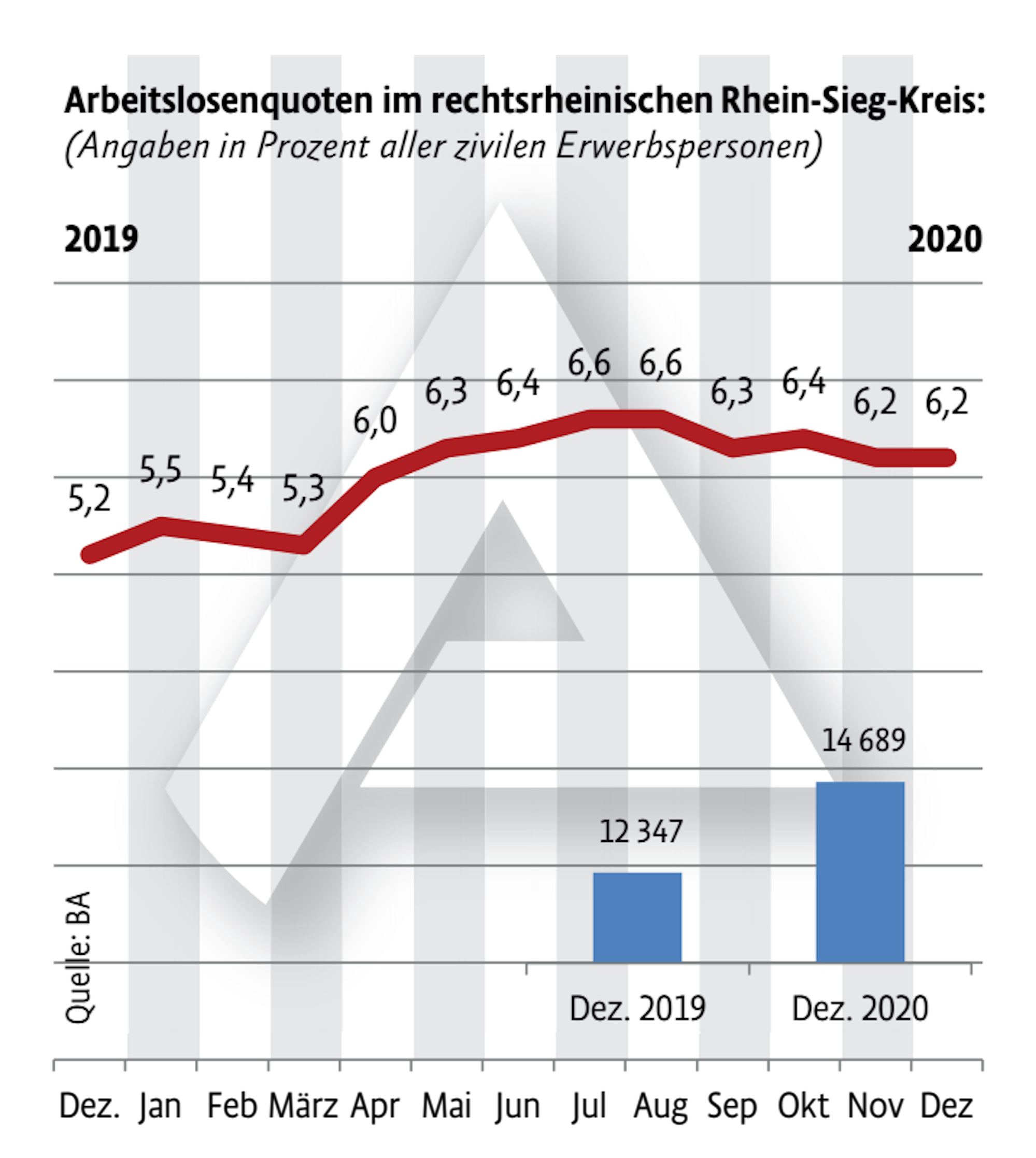 Im gesamten Zuständigkeitsbereich der Agentur ging die Zahl der offiziell arbeitslos gemeldeten Personen um rund 400 zurück – von 32 529 im November auf 32 122 im Dezember. Gegenüber dem Dezember 2019 zeigt sich aber eine Zunahme der Arbeitslosigkeit um rund 5800 oder 22 Prozent. In den Kommunen des rechtsrheinischen Rhein-Sieg-Kreises sank die Zahl der Arbeitslosen von 14 817 im November auf 14 689 im Dezember. Im Dezember 2019 lag diese Zahl mit 12 347 allerdings deutlich niedriger. Die Arbeitslosenquote liegt unverändert bei 6,2 Prozent.