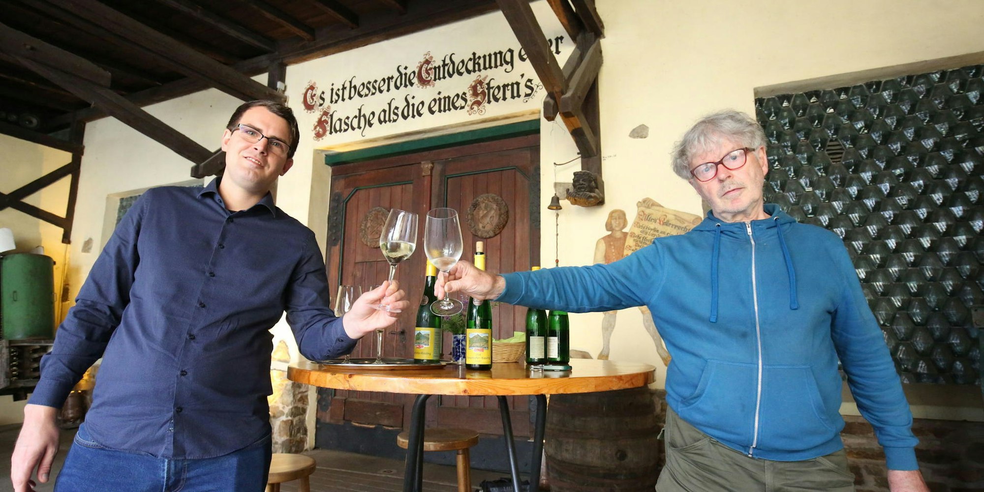 Sommelier Dennis Blanke (l.) probierte mit Winzer Karl-Heinz Broel drei Jahrgänge des Tonschiefer-Rieslings.