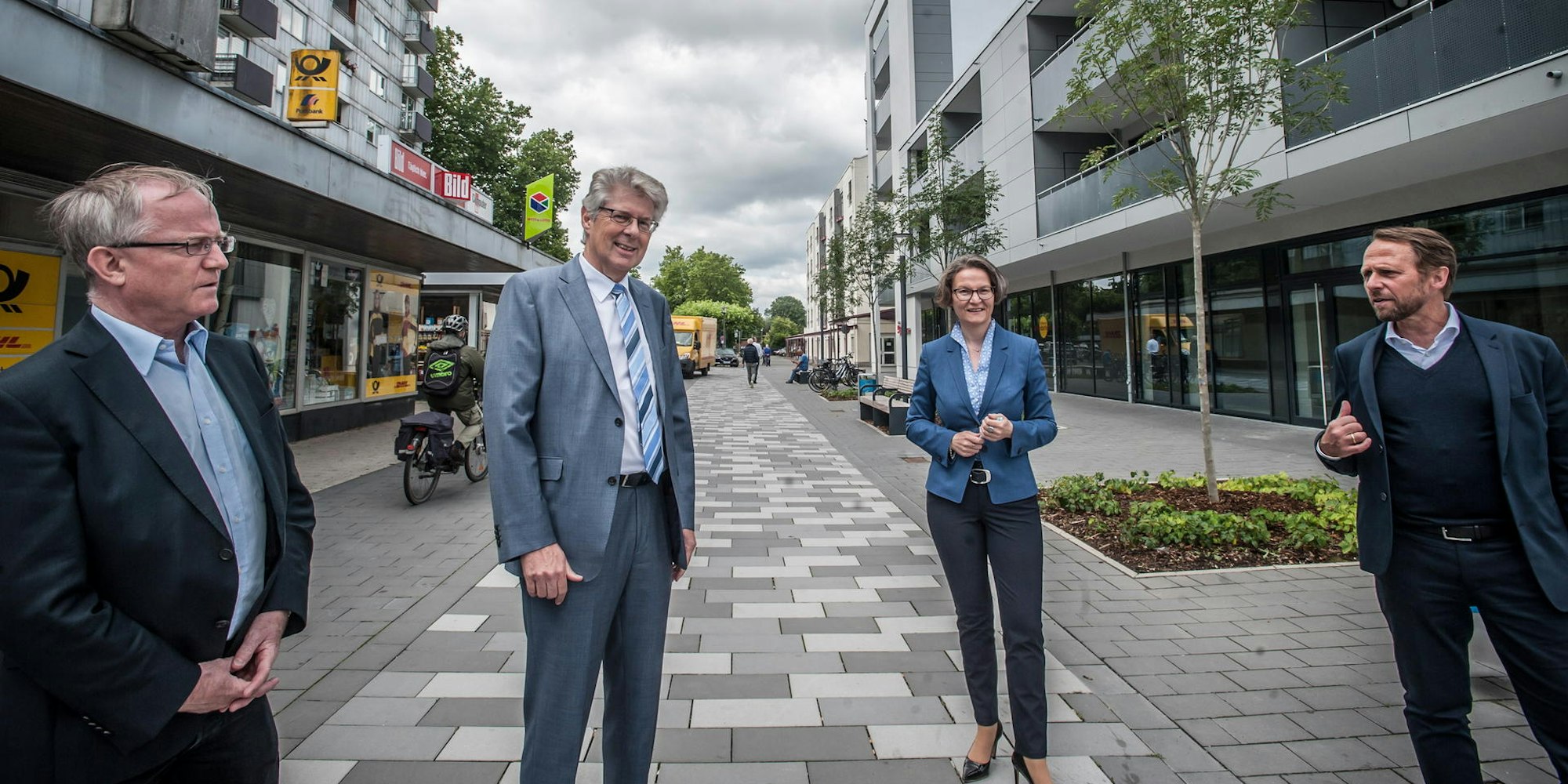 Zwischen vorbildlichem WGL-Neubau (rechts) und Verwahrlosung (links): Landtagsabgeordneter Rüdiger Scholz (CDU), WGL-Geschäftsführer Wolfgang Mues, Kommunal-Ministerin Ina Scharrenbach (CDU) und Oberbürgermeister Uwe Richrath (SPD).