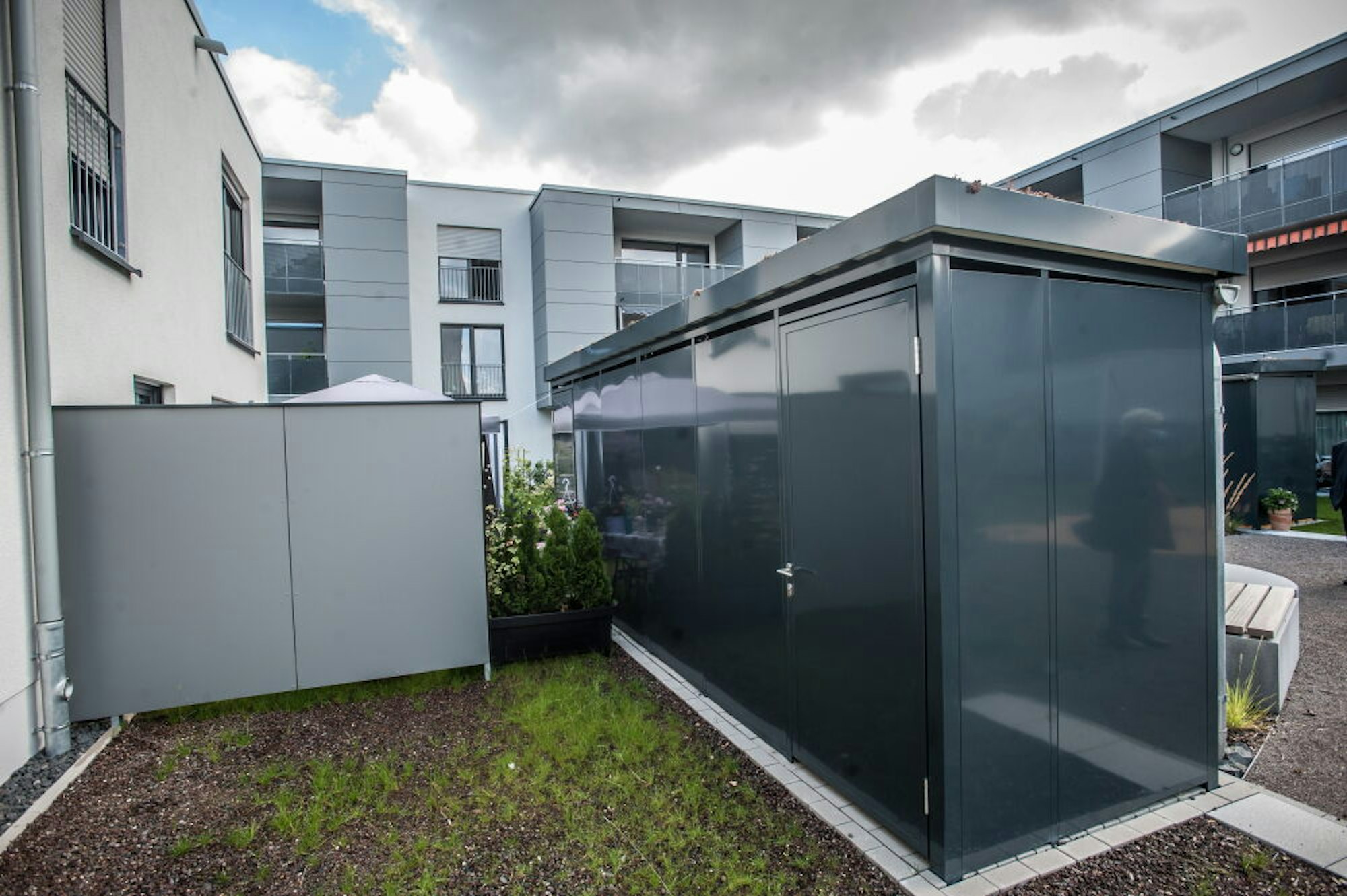 Ein Ersatz für fehlende Keller stellen diese Kästen im Gartenbereich des Rheindorfer Karree dar.