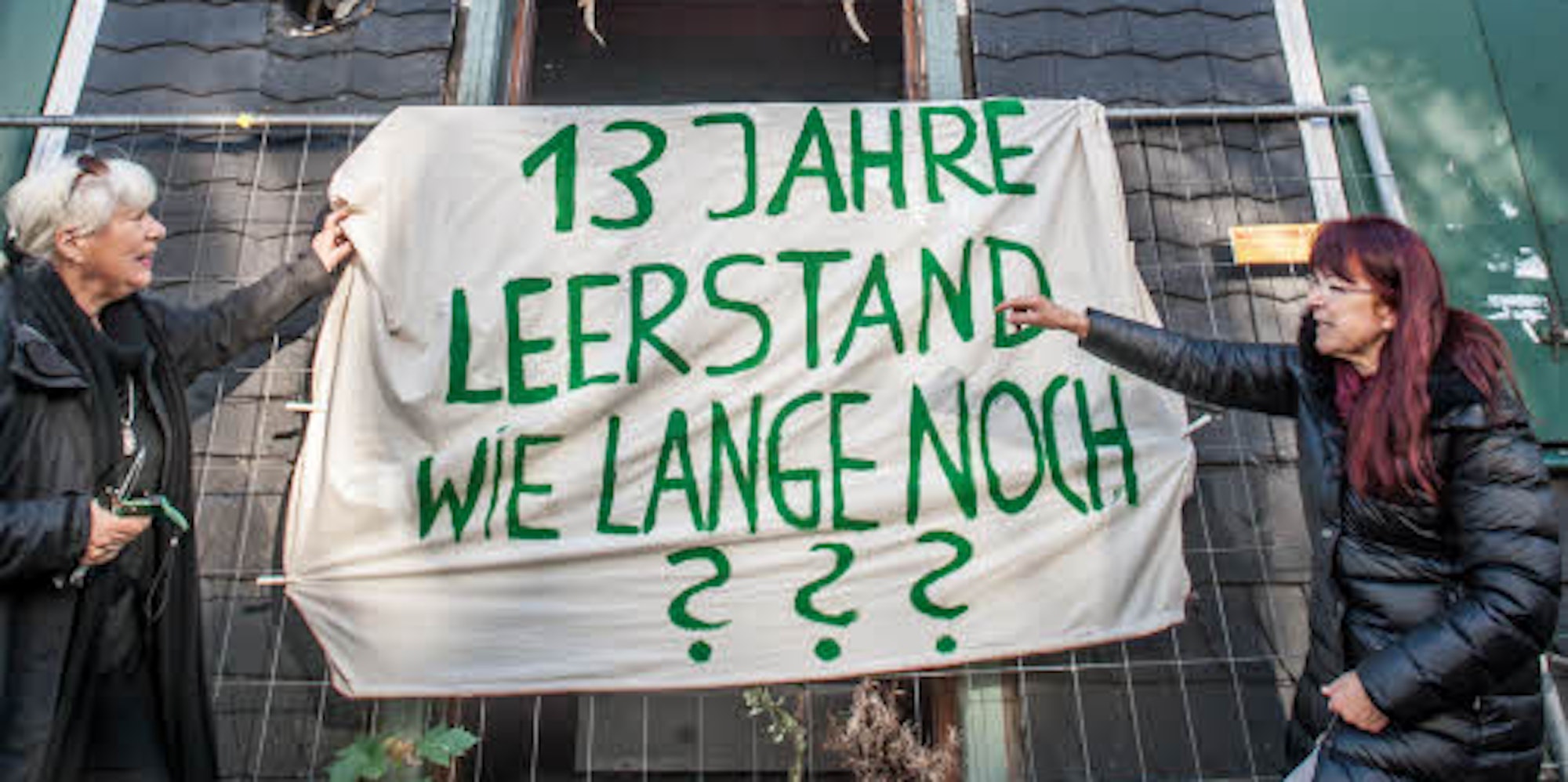 Am Freitag befestigten ein paar Mutige aus einer Schlebuscher Runde ein Banner an dem inzwischen morschen Fachwerkhaus, um ihren Unmut über den gefühlt ewigen Leerstand auszudrücken.