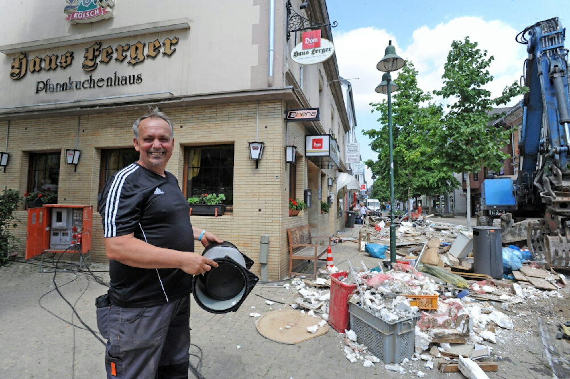Leverkusen – Serif Limani treten regelmäßig die Tränen in die Augen. Vor Trauer und Existenzangst, wenn die verschlammten Kölschgläser klirrend in den Container scheppern und ein Kühlschrank nach dem anderen aus dem Keller des Schlebuscher Pfannkuchenhaus Ferger getragen wird. Das komplette Inventar ist hinüber, die Haustechnik sowieso. Erst Corona, dann die Flut. „Ich fange bei Minus Null an“, sagt der Wirt. Aber, er will wieder anfangen, trotz allem, was soll er sonst machen? „Ich habe noch nie Angst vor Arbeit gehabt. Niemals aufgeben.“ Und das Wichtigste sei ja überhaupt, dass alle Menschen außer Gefahr sind. Und dann ist da ja auch noch der zweite Grund, der ihn zu Tränen rührt: Die vielen Helfer, die mit anpacken und Schokolade und liebe Worte spenden. „Dieses Dorf ist einfach einmalig“, sagt Limani.