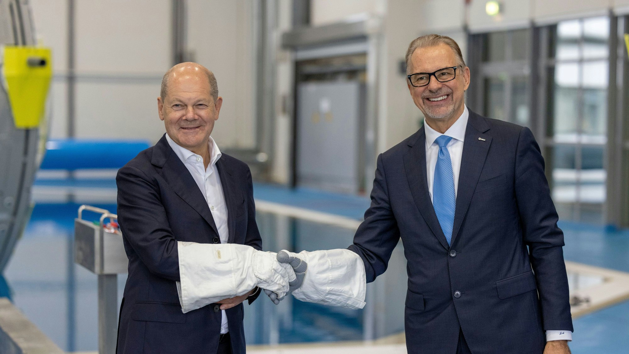 Mit Astronautenhandschuhen gaben sich Bundeskanzler Olaf Scholz (l, SPD) und ESA-Generaldirektor Dr. Josef Aschbacher die Hand während seines Besuchs des Deutschen Zentrum für Luft- und Raumfahrt (DLR) und des Astronautenzentrums der Europäischen Weltraumorganisation ESA.