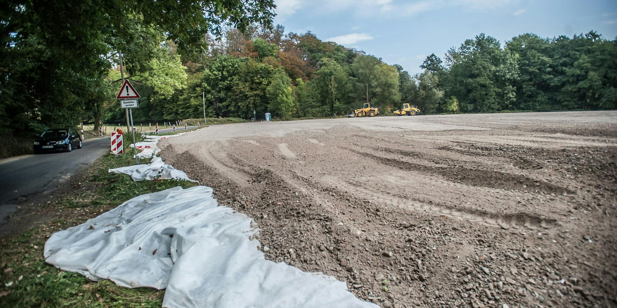 Die Baustelle ruht, nachdem Open Grid ohne Genehmigung im Landschaftsschutz eine Wiese mit Schotter und Recycling-Kunststoff aufschüttete. Der Kreis intervenierte.