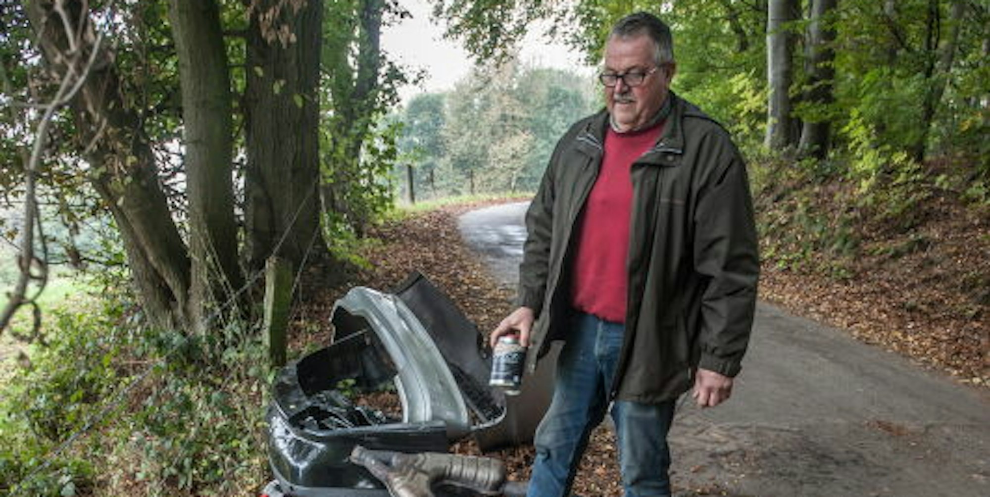 Leverkusen – Es ist deutlich, so langsam hat Franz-Josef Klein die Nase gestrichen voll: „Der Haufen hier ist jetzt ganz neu“, sagt der Bauer aus Boddenberg und dreht einen Zylinderkopf um, wahrscheinlich BMW oder Audi, der am Wegesrand liegt. Neben dem öligen Motorteil liegen Pirelli-Niederquerschnittsreifen und auch Gefahrstoffe, etwa matte Auto-Sprühfolie, Farbe „Chocolate Brown pearl“, zwei Katalysatoren, eine silberne Audi-Kofferraumklappe, Tür-Innenverkleidungen und ein Canon Tischkopierer. Es muss ein Autoschrauber sein, vielleicht ein „Tuner“, der Autos aufmotzt, der schon mehrfach seinen Müll an dem Feldweg in die Natur gekippt hat.