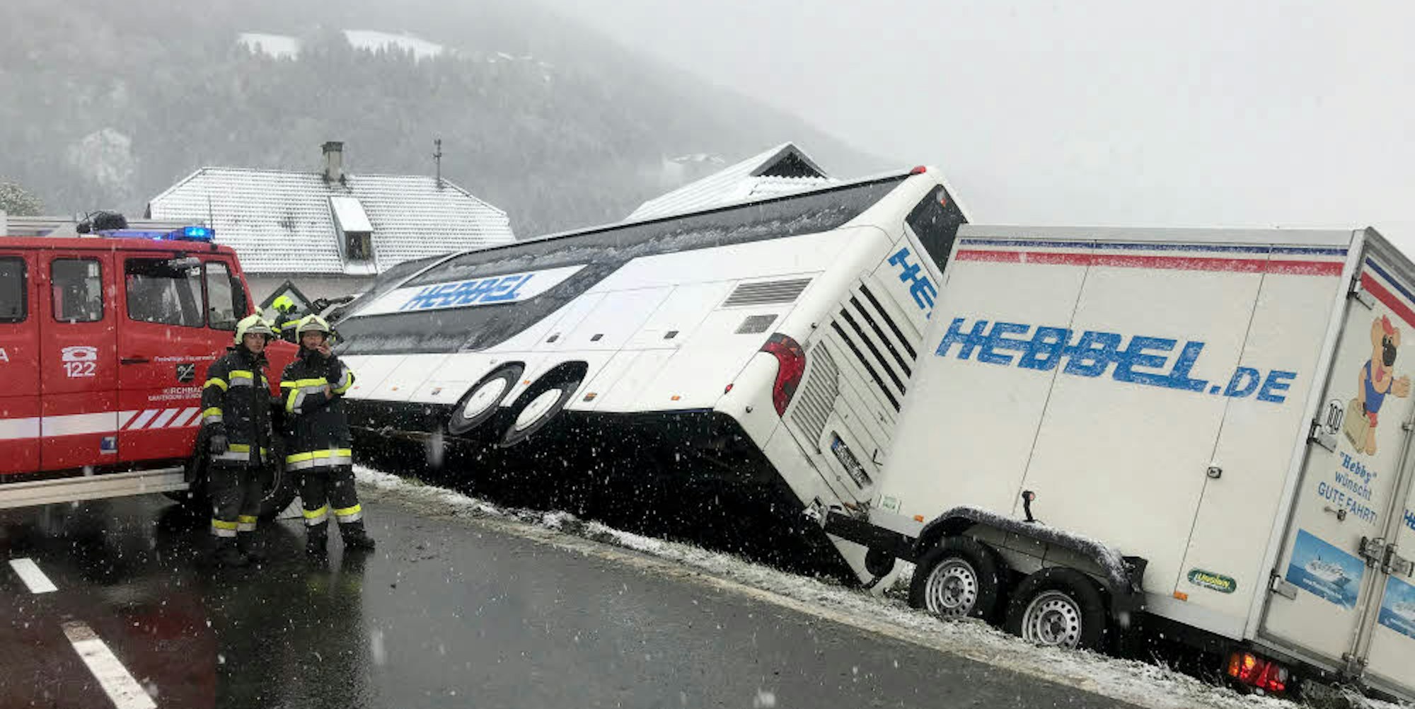 Im Straßengraben landete ein Hebbel-Bus mit 76 Kreuzfahrern auf dem Weg nach Italien.