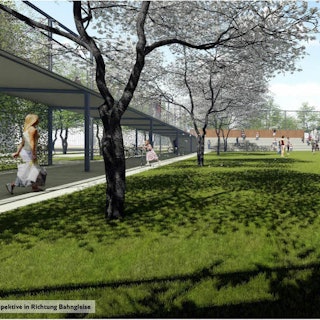Die Europa-Allee erschließt auch die Westseite der Neuen Bahnstadt. Dort werden weitere Häuser entstehen. Eine Wand schirmt den Bereich schon jetzt vom Bahnlärm ab. Außerdem werden weitere Sumpfeichen gepflanzt. Die Bäume sollen schnell wachsen. (tk)