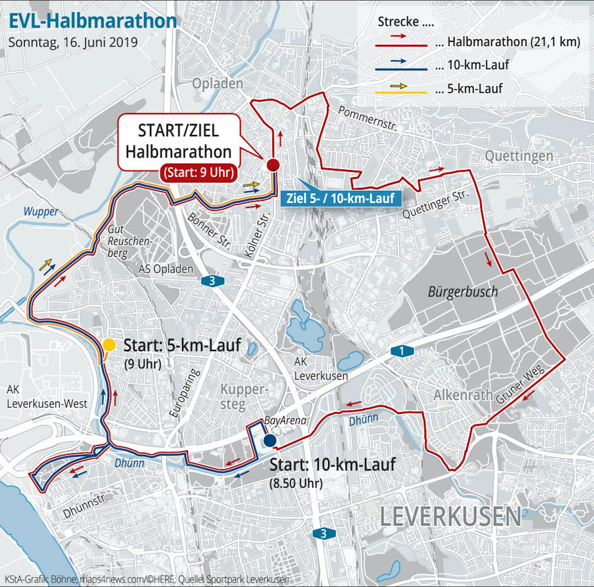 Leverkusen – Im Rahmen des 19. EVL-Halbmarathons kommt es am Sonntag, 16. Juni, zu Verkehrsbehinderungen und Straßensperrungen. Die Sperrungen und Informationen im Überblick: