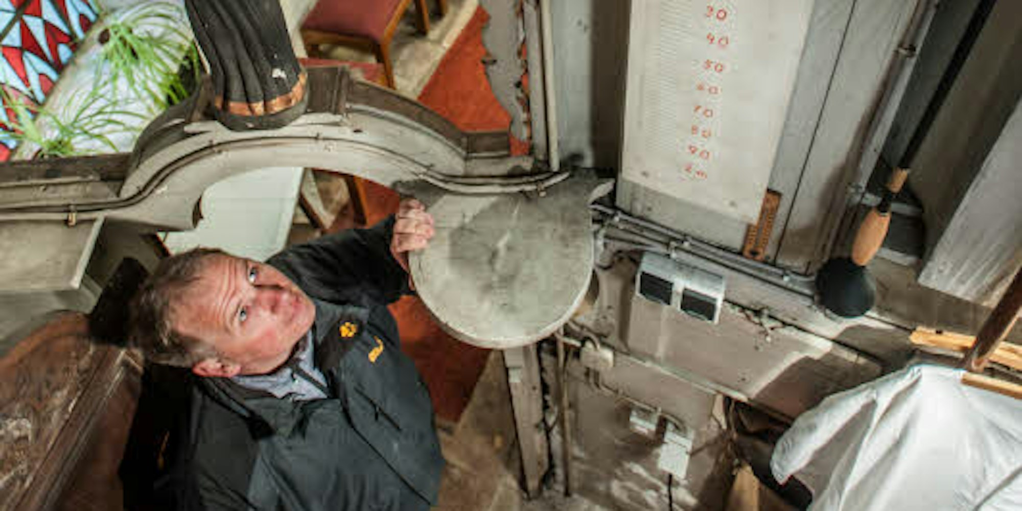 Leverkusen – Christian Kaltenbach, der Küster von Schlebusch, öffnet die kleine Holztür, die in den schmalen Raum hinter dem Holzaltar in der Gezelinkapelle führt. Eine kleine Sakristei, dort ziehen sich sonst die Pfarrer um. „Hier sehen Sie es“, er deutet auf eine Skala, wie an einem Thermometer, an der ein über einen Seilzug gesteuerter Zeiger fast ganz oben den Wert 16 anzeigt. „Das heißt, wir haben heute 16 Zentimeter Wasser im Brunnen,“ sagt Kaltenbach und zieht die Stirn in Falten.