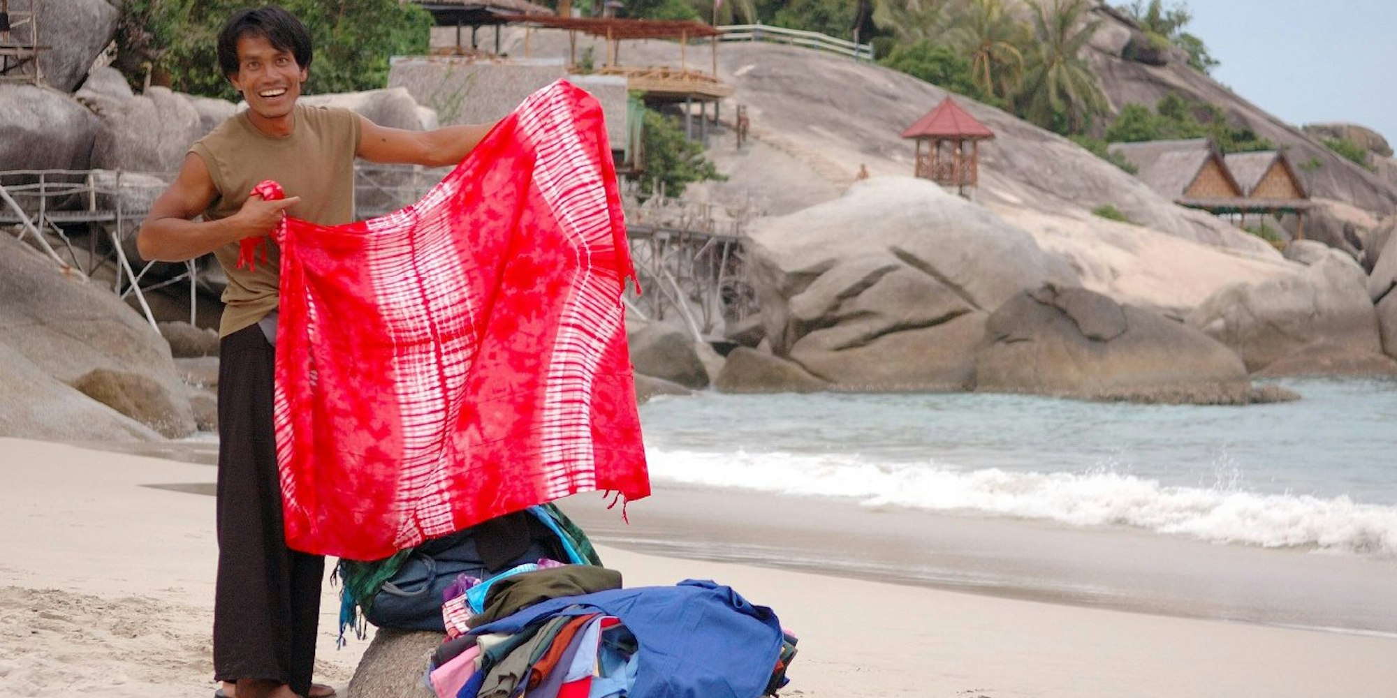 Ein thailändischer Souvenirverkäufer präsentiert gebatikte Tücher am Strand von Koh Phangan.