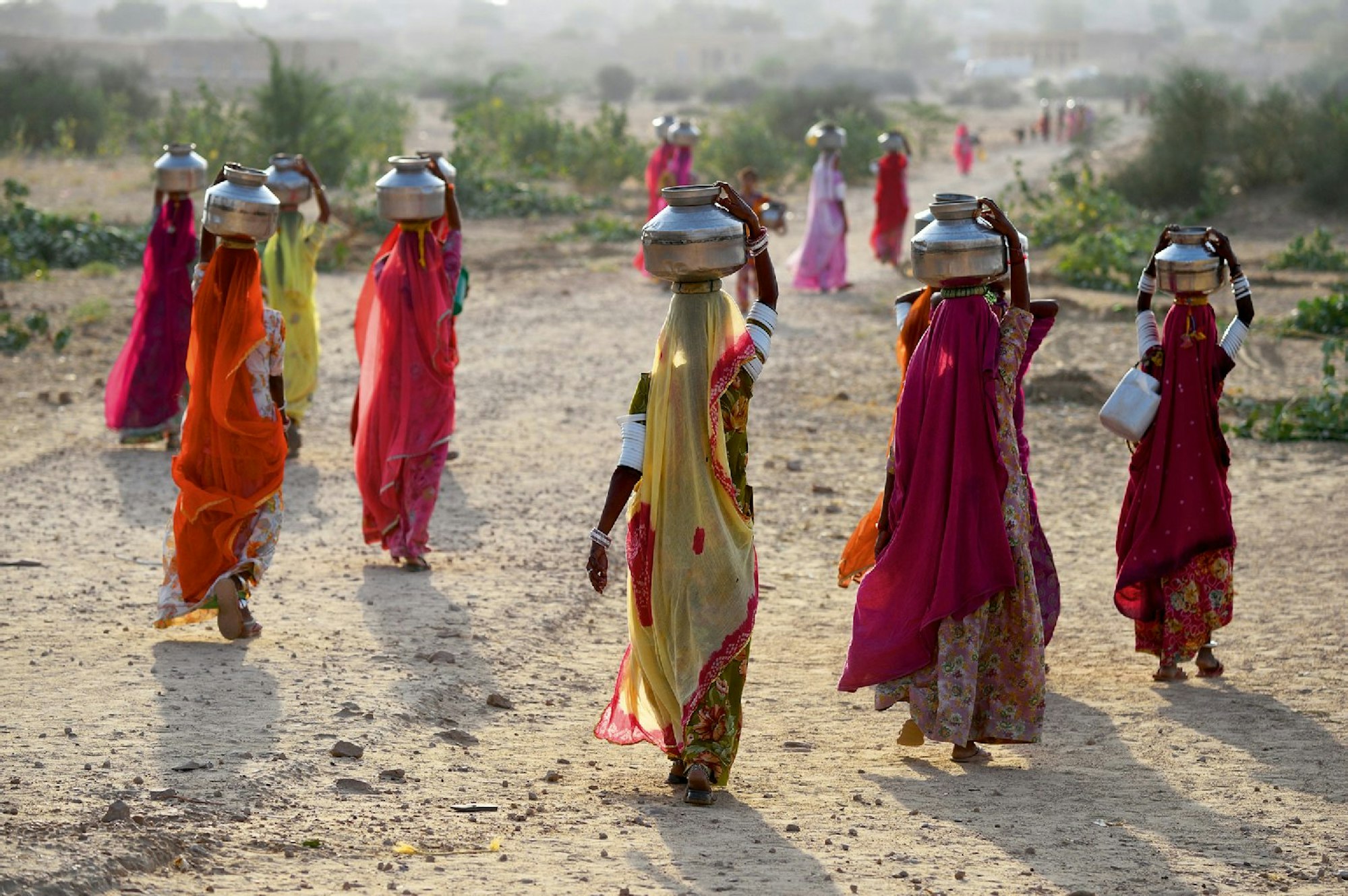 Frauen des Dorfes Khuba Ram in der indischen Wüste Thar auf dem Weg zum Brunnen