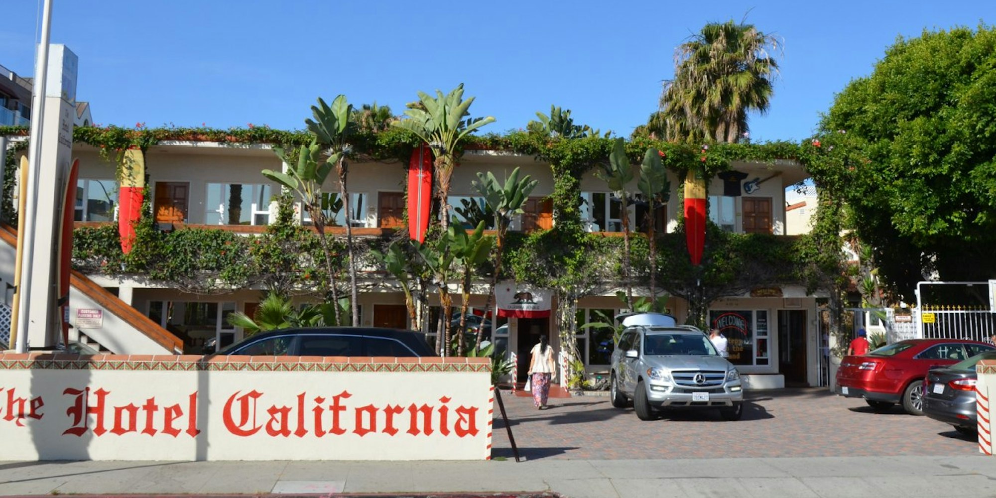 Vielen gilt das „The Hotel California“ in Santa Monica als das Hotel, das im Song vorkommt. Von der 1670 Ocean Avenue sind es keine drei Minuten bis hinunter zum Pazifik-Strand, der Badewanne von Los Angels. Geht man hinter dem Drei-Sterne-Hotel am Strand nach links kommt man zum berühmten Venice Beach, wo der Kult um den schönen Körper exzessiv ausgelebt wird und es im Sommer nur so wimmelt von Schönheiten aller Art. Biegt man rechts ab, ist man schnell am Santa Monica Pier, einer hunderte Meter langen Seebrücke mit Riesenrad, dass man auch von den hinteren Zimmern des Hotels aus sieht. Mitten auf der Seebrücke ein beliebtes Touristenfotomotiv: Ein Schild zeigt den Endpunkt der „Road 66“ an. Links und rechts liegen Traumreviere für Surfer.
