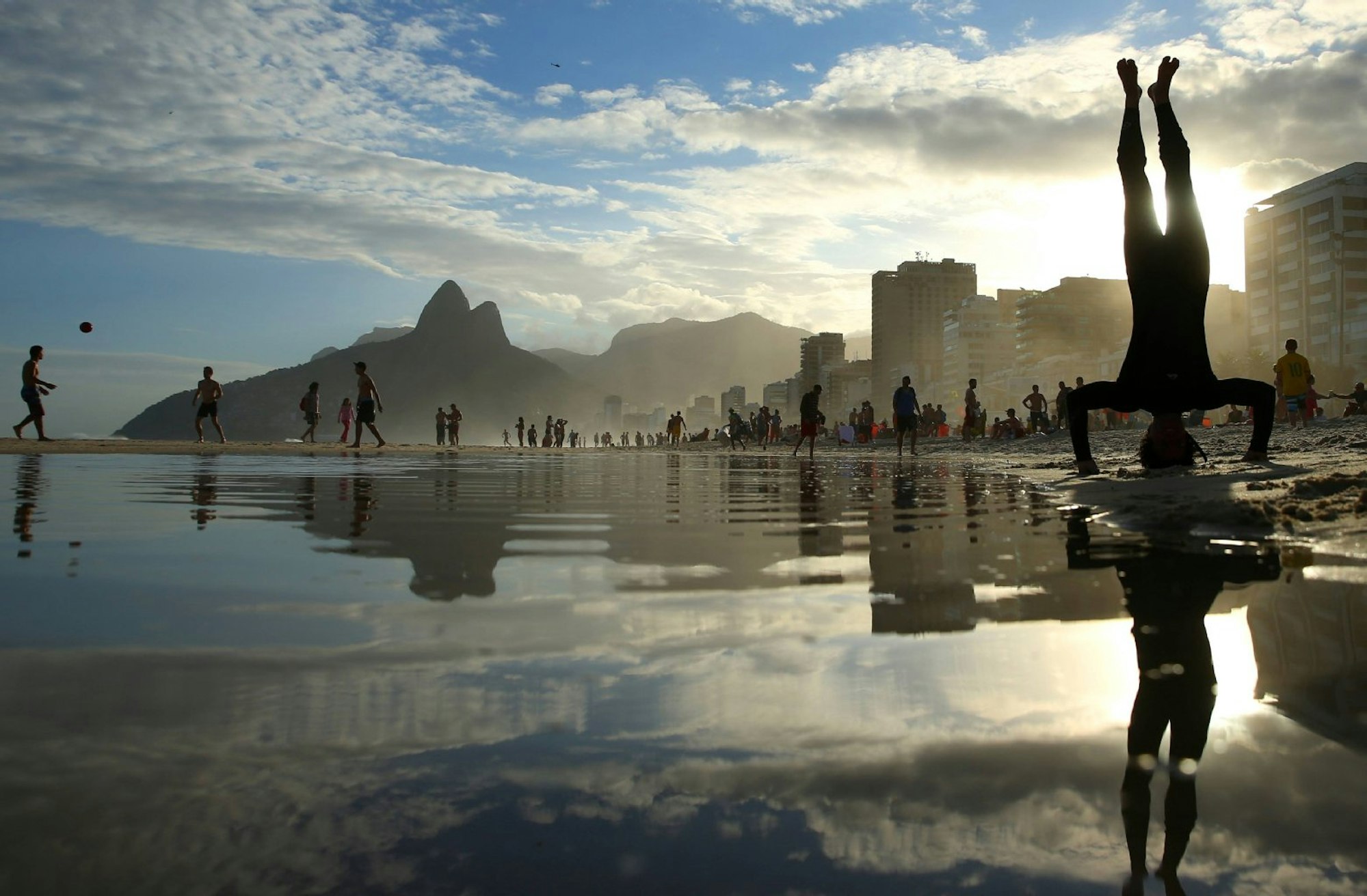 Die Perspektive wechseln: Das geht, wenn man sich auf ein unbekanntes Reiseziel einlässt – oder einen Kopfstand macht, wie hier am Strand von Ipanema, Rio de Janeiro, Brasilien.