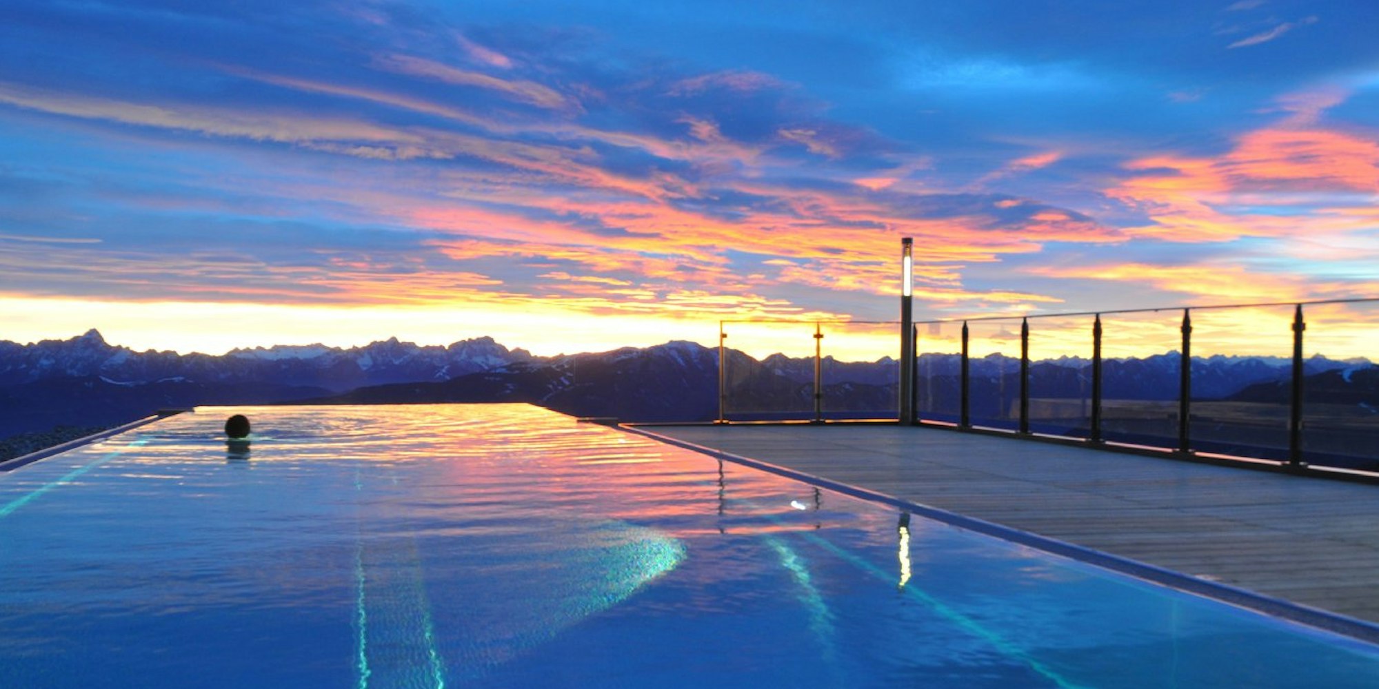 Im Infinity-Pool scheint das 32 Grad Celsius warme Wasser mit den Skigebieten Kärntens zu verschmelzen. Noch näher sind die Gipfel der gesamten Alpen nur durch das Teleskop an der Sternenwarte zu sehen.