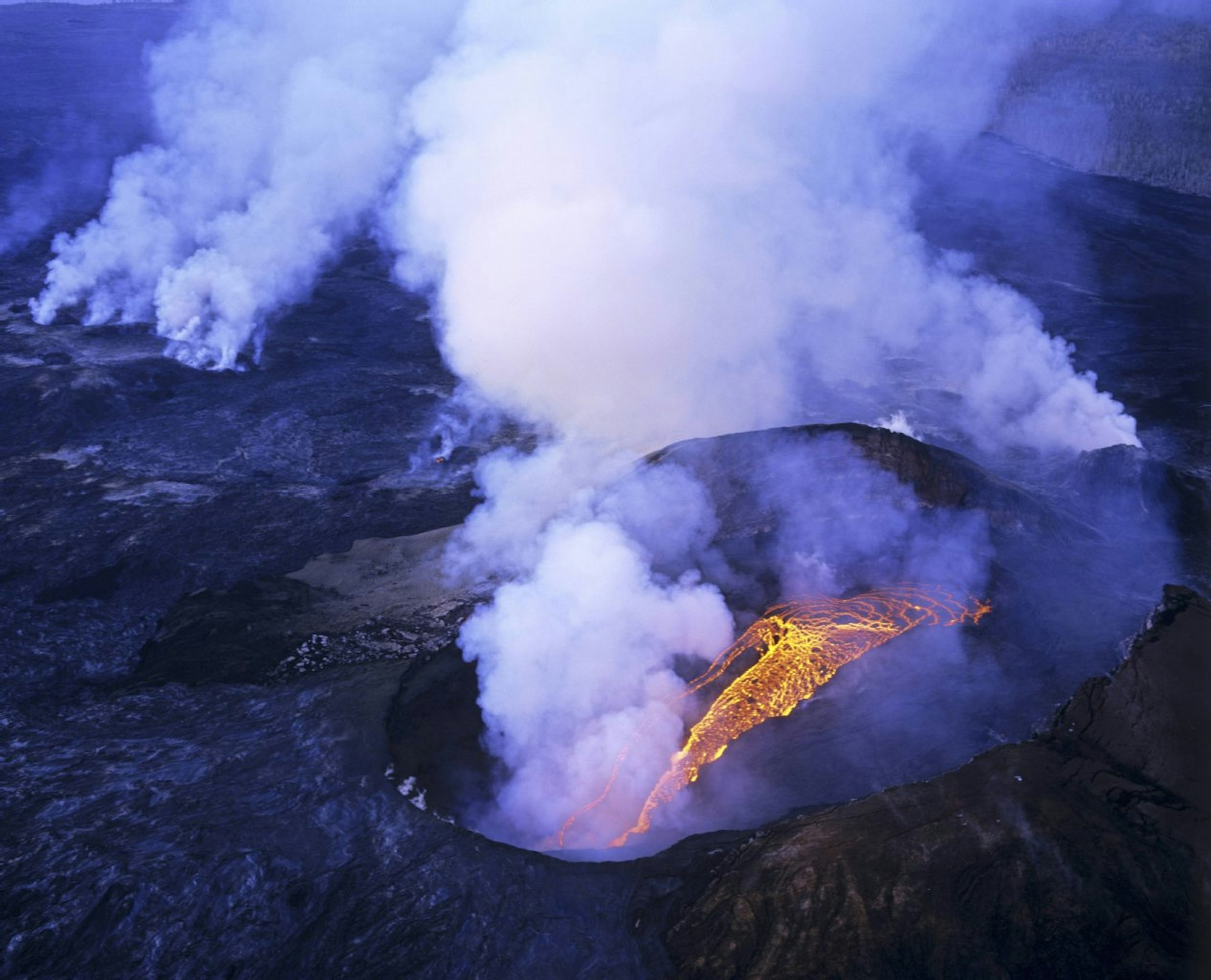 Der Kilauea ist einer der aktivsten Vulkane der Welt. Seit Anfang 1983 speit er täglich Lava. Passenderweise bedeutet sein Name „viel spucken“. Der schier endlose Schmelzfluss landet im Meer vor der hawaiischen Insel Big Island, auf der insgesamt fünf Vulkane stehen. Rund 35 Kilometer südlich von Hawaii wächst im Pazifik übrigens ein neuer Vulkan heran. Zwar ist er schon etwa drei Kilometer hoch; bis er an die Meeresoberfläche stößt, könnte es noch bis zu 100.000 Jahre dauern.