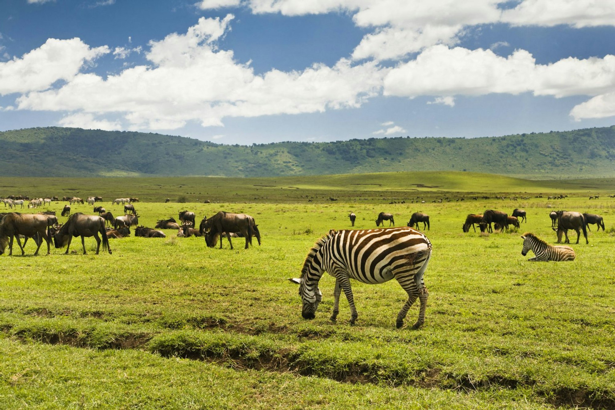 Gnus und Zebras grasen zusammen im Ngorongoro-Nationalpark.