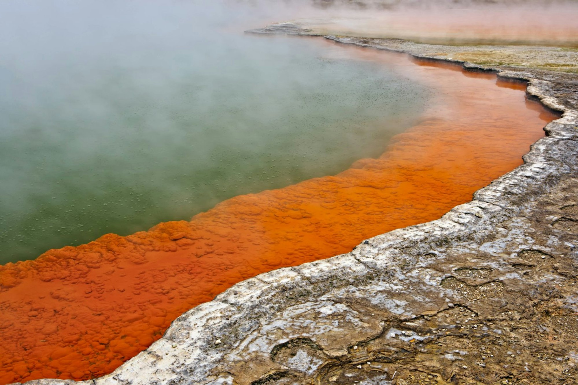Wai-O-Tapu (Maori für „Heilige Wasser“) ist ein Gebiet mit geothermischer Aktivität. Es liegt in dem Ort Rotorua auf der neuseeländischen Nordinsel und ist übersät mit Tümpeln, Seen und Kratern, von denen etwa Schwefel nebelartig aufsteigt. Der Champagner Pool, ein Highlight des Parks, beeindruckt durch sein zweifarbiges Aussehen. Während es in der Mitte des Sees blau-grünlich schimmert, sticht der Rand durch sein leuchtendes Orange ins Auge. Die verschiedenen Farben werden durch unterschiedliche Mineralien hervorgerufen.