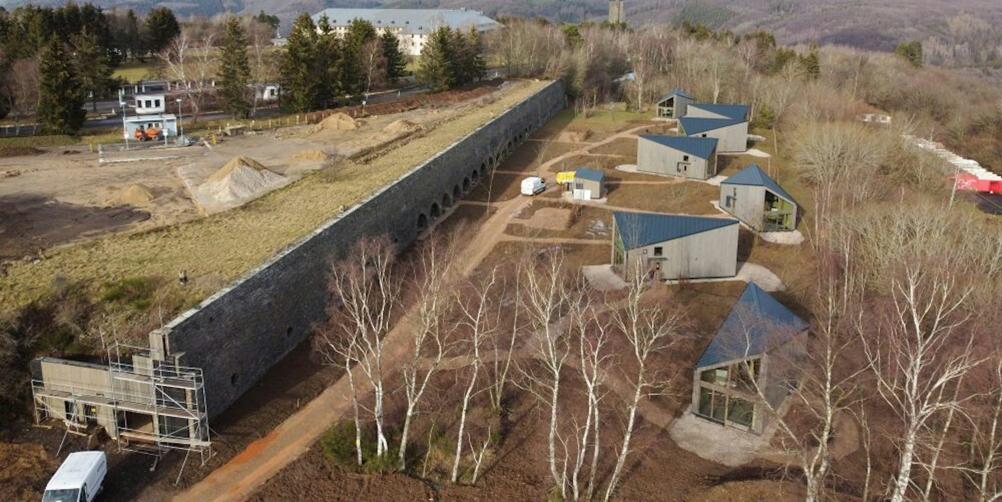 Die neuen Ferienhäuser und die Kasematten liegen am östlichen Rand von Vogelsang. Das große Gebäude im Hintergrund ist die ehemalige belgische Truppenunterkunft „Van Dooren“.