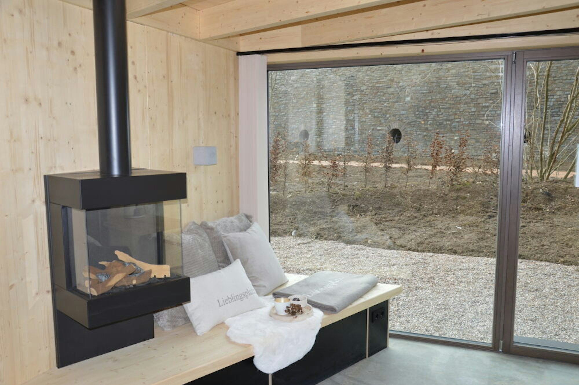Neben der Sitzecke vor den großen Panoramafenstern befindet sich der gasbetriebene Kamin.